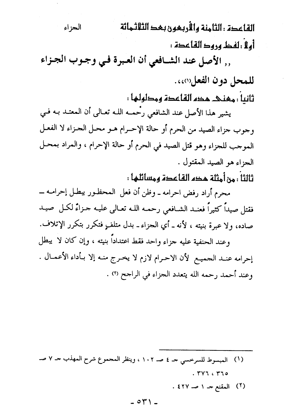 يشير هذا الأصل عند الشافعي رحمه الله تعالى أن المعتد به في وجوب جزاء الصيد من الحرم أو حالة الإحرام هو محل الجزاء لا الفعل الموجب للجزاء وهو قتل الصيد في الحرم أو حالة الإحرام، والمراد بمحل الجزاء هو الصيد المقتول.