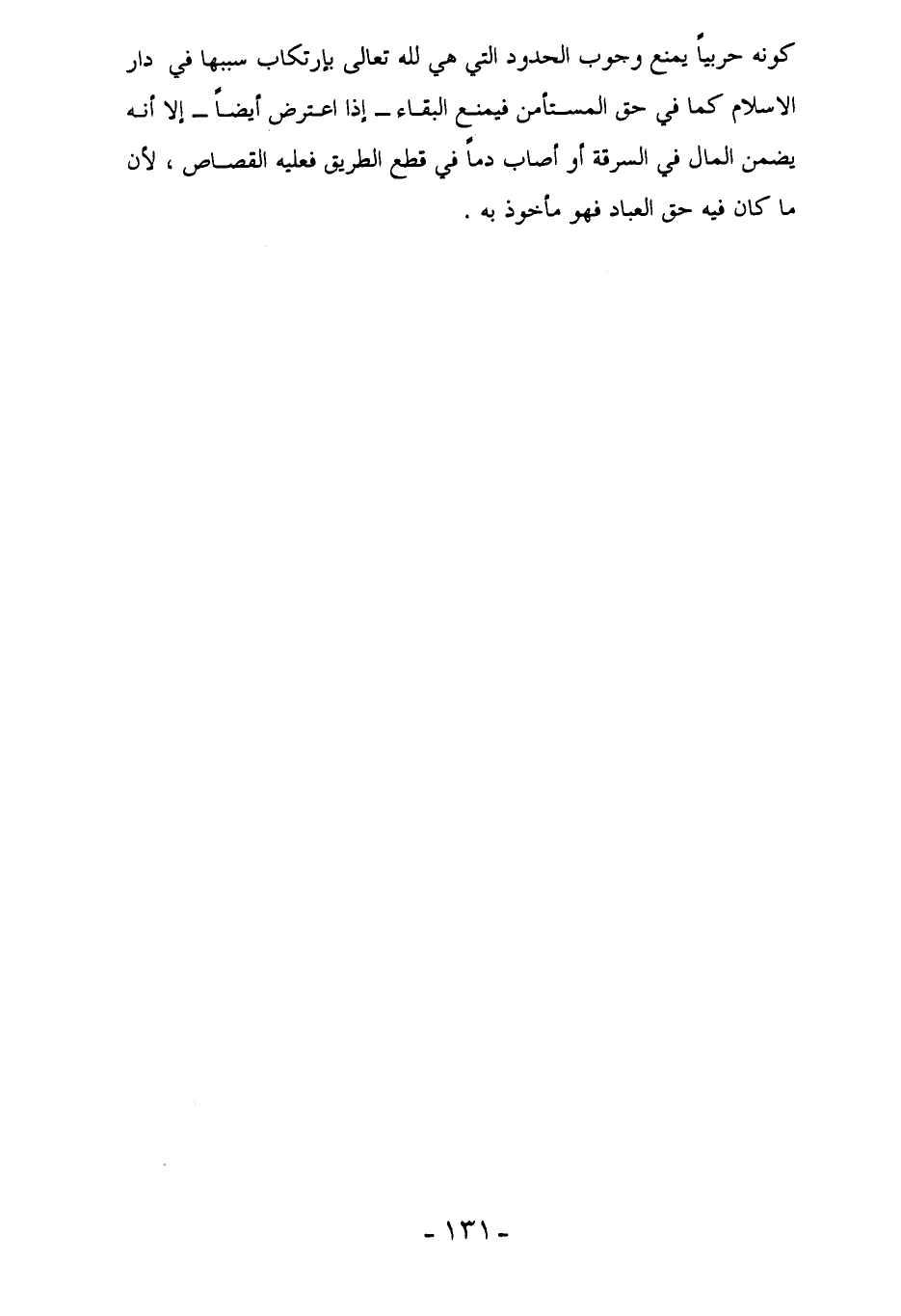 كونه حربياً يمنع وجوب الحدود التي هي لله تعالى بإرتكاب سببها في دار الإِسلام كما في حق المستأمن فيمنع البقاء - إذا اعترض أيضاً - إلا أنه يضمن المال في السرقة أو أصاب دماً في قطع الطريق فعليه القصاص، لأن ما كان فيه حق العباد فهو مأخوذ به.
