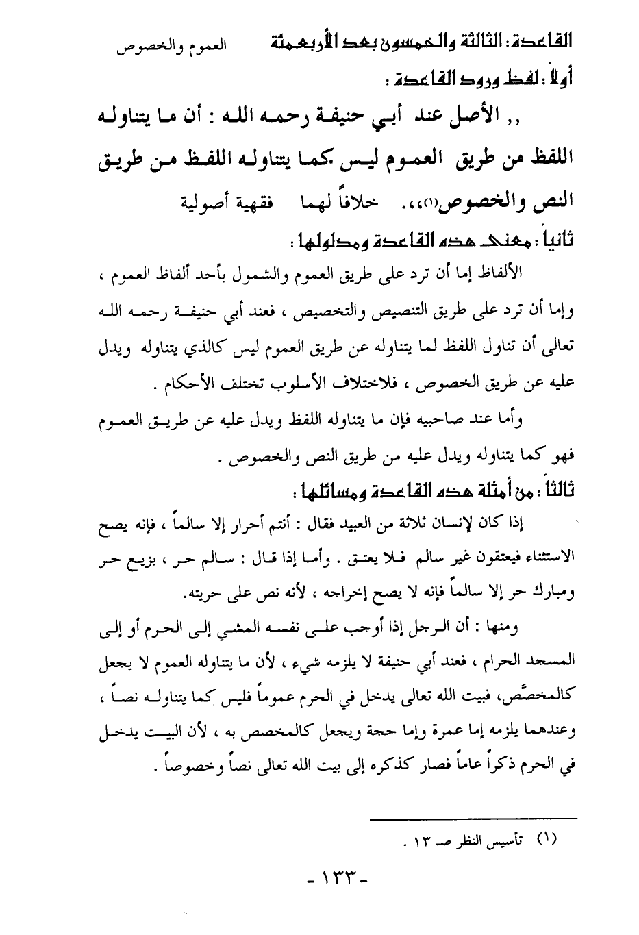 " الأصل عند أبي حنيفة رحمه الله: أن ما يتناوله اللفظ من طريق العموم ليس كما يتناوله اللفظ من طريق النص والخصوص (¬1) ". خلافاً لهما [فقهية أصولية]