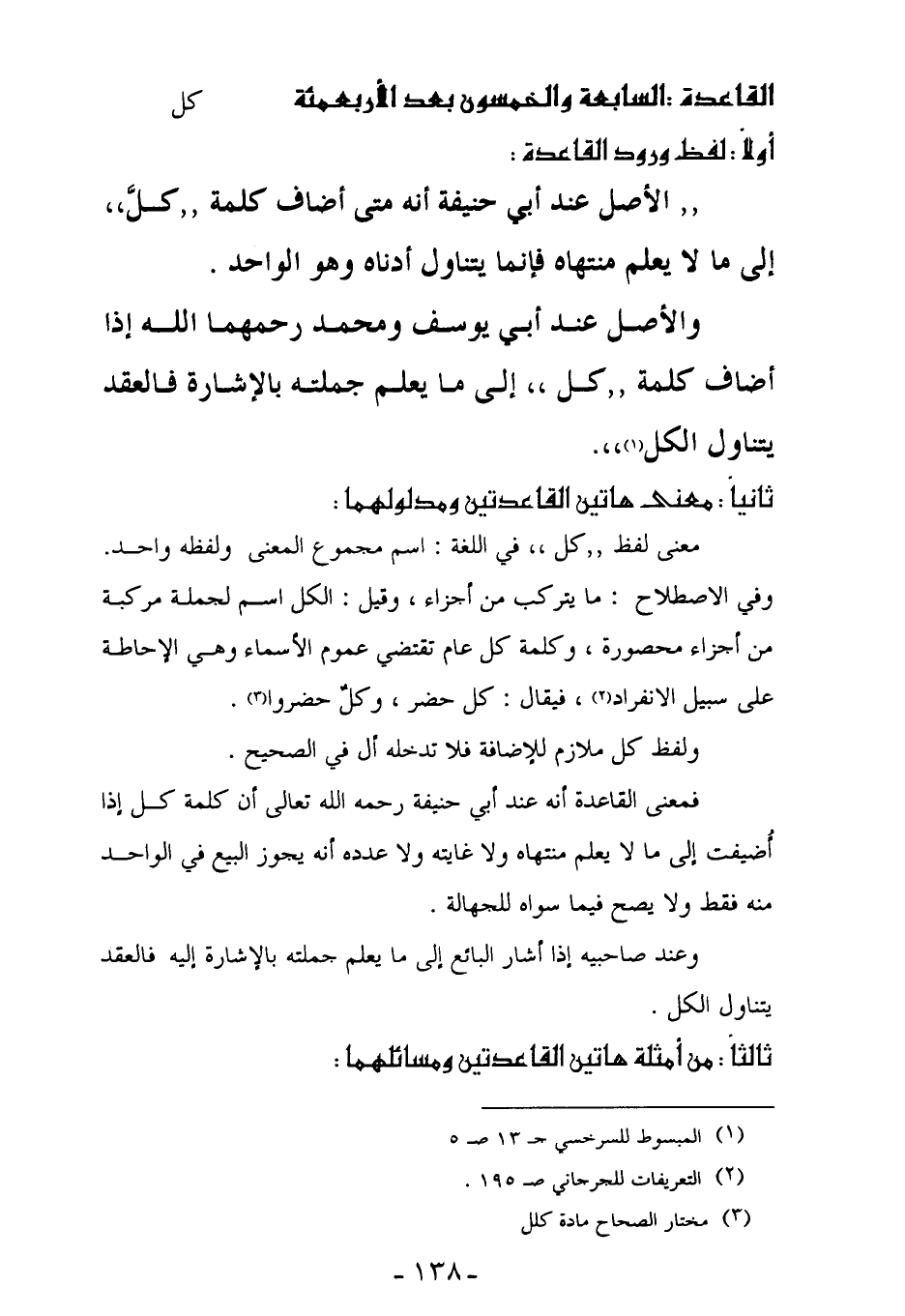 فمعنى القاعدة أنه عند أبي حنيفة رحمه الله تعالى أن كلمة كل إذا أُضيفت إلى ما لا يعلم منتهاه ولا غايته ولا عدده أنه يجوز البيع في الواحد منه فقط ولا يصح فيما سواه للجهالة.