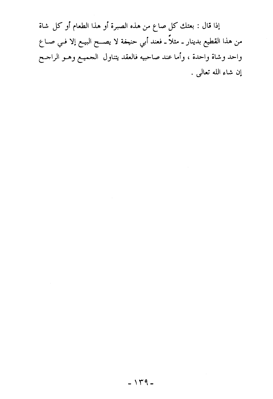 إذا قال: بعتك كل صاع من هذه الصبرة أو هذا الطعام أو كل شاة من هذا القطيع بدينار - مثلاً - فعند أبي حنيفة لا يصح البيع إلا في صاع واحد وشاة واحدة، وأما عند صاحبيه فالعقد يتناول الجميع وهو الراجح إن شاء الله تعالى.