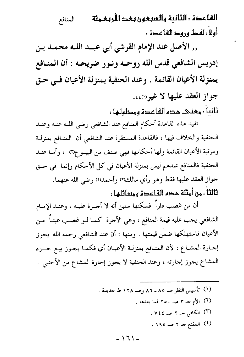 " الأصل عند الإِمام القرشي أبي عبد الله محمَّد بن إدريس الشافعي قدس الله روحه ونور ضريحه: أن المنافع بمنزلة الأعيان القائمة. وعند الحنفية بمنزلة الأعيان في حق جواز العقد عليها لا غير (¬1) ".