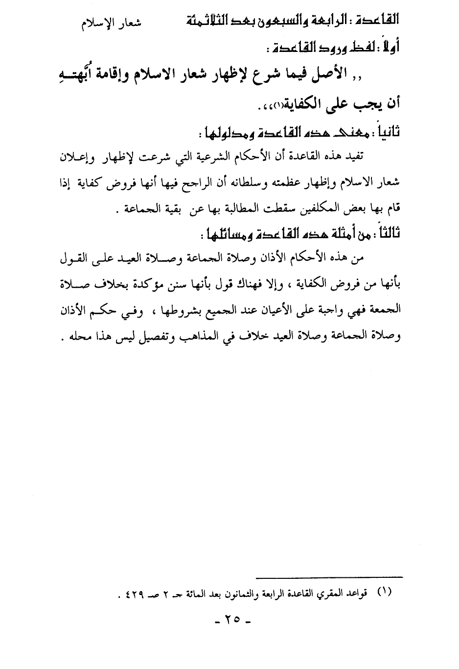 تفيد هذه القاعدة أن الأحكام الشرعية التي شرعت لإظهار وإعلان شعار الإِسلام وإظهار عظمته وسلطانه أن الراجح فيها أنها فروض كفاية إذا قام بها بعض المكلفين سقطت المطالبة بها عن بقية الجماعة.