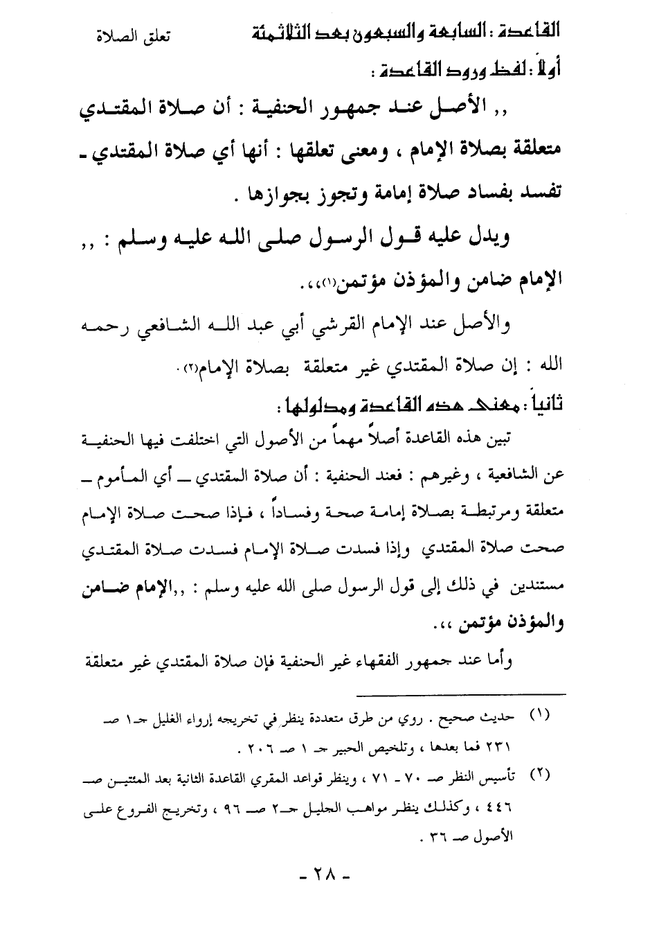 تبين هذه القاعدة أصلاً مهماً من الأصول التي اختلفت فيها الحنفية عن الشافعية، وغيرهم: فعند الحنفية: أن صلاة المقتدي - أي المأموم - متعلقة ومرتبطة بصلاة إمامة صحة وفساداً، فإذا صحت صلاة الإمام صحت صلاة المقتدي وإذا فسدت صلاة الإمام فسدت صلاة المقتدي مستندين في ذلك إلي قول الرسول صلى الله عليه وسلم: "الإمام ضامن والمؤذن مؤتمن".