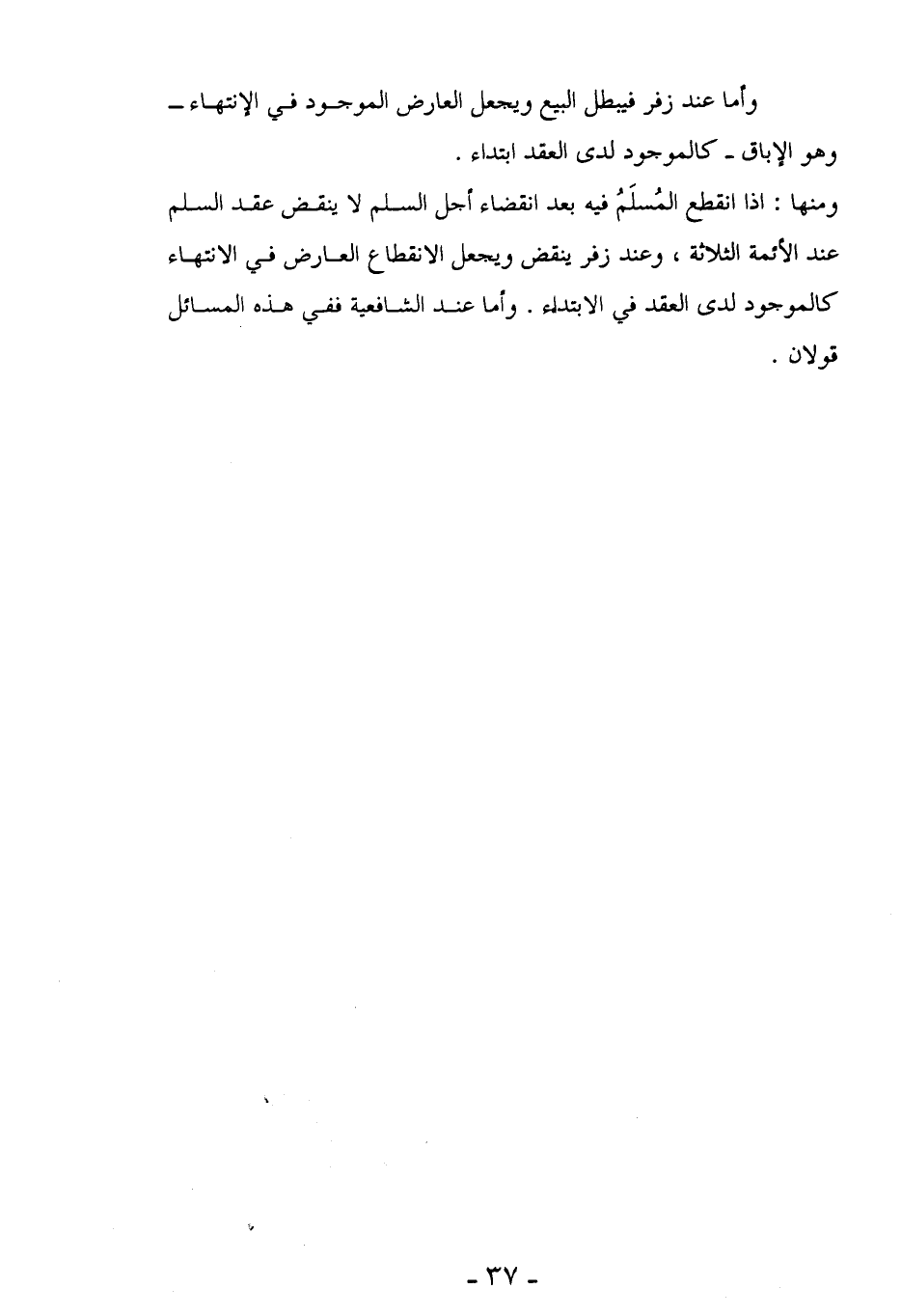 ومنها: إذا انقطع المُسلَمُ فيه بعد انقضاء أجل السلم لا ينقض عقد السلم عند الأئمة الثلاثة، وعند زفر ينقض ويجعل الانقطاع العارض في الانتهاء كالموجود لدى العقد في الابتداء. وأما عند الشافعية ففي هذه المسائل قولان.
