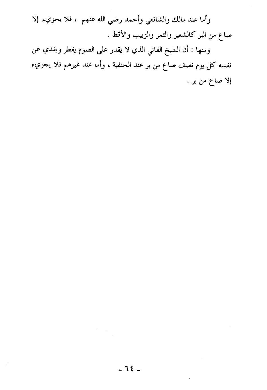 ومنها: أن الشيخ الفاني الذي لا يقدر على الصوم يفطر ويفدي عن نفسه كل يوم نصف صاع من بر عند الحنفية، وأما عند غيرهم فلا يجزيء إلا صاع من بر.