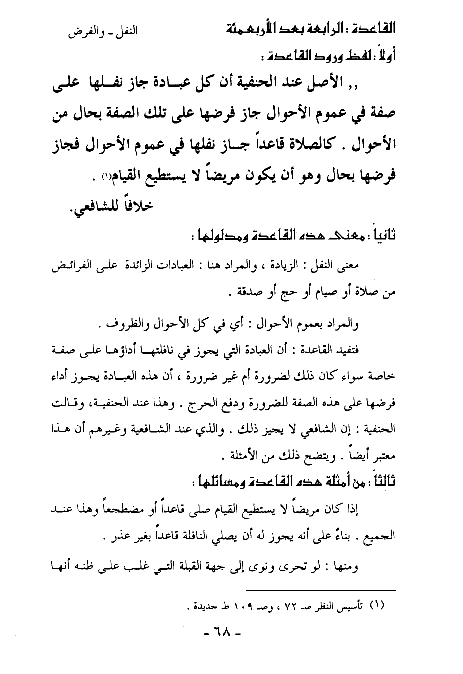 فتفيد القاعدة: أن العبادة التي يجوز في نافلتها أداؤها على صفة خاصة سواء كان ذلك لضرورة أم غير ضرورة، أن هذه العبادة يجوز أداء فرضها على هذه الصفة للضرورة ودفع الحرج. وهذا عند الحنفية، وقالت الحنفية: إن الشافعي لا يجيز ذلك. والذي عند الشافعية وغيرهم أن هذا معتبر أيضاً. ويتضح ذلك من الأمثلة.