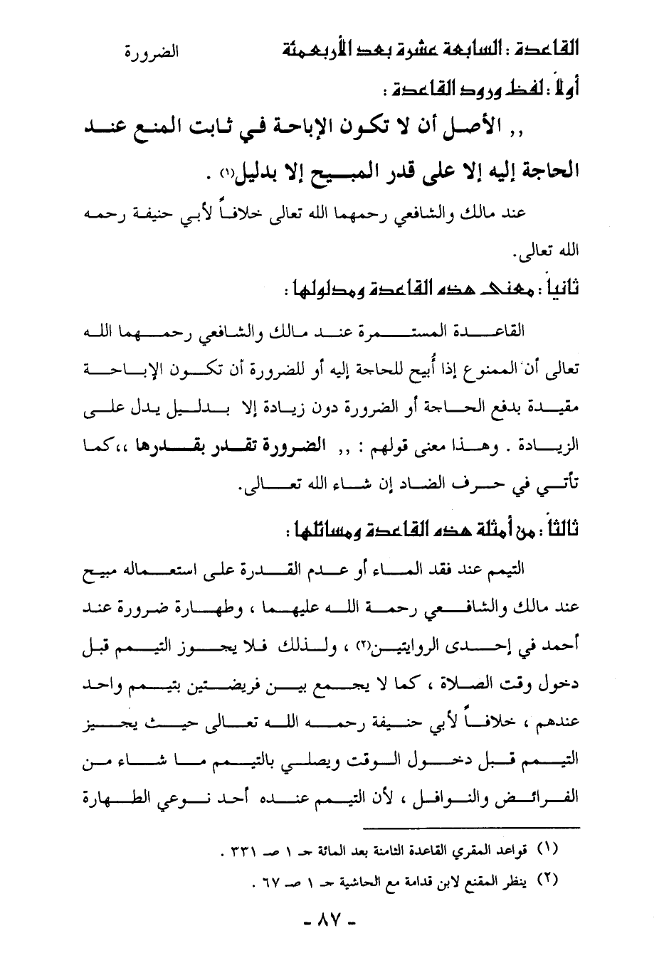 القاعدة المستمرة عند مالك والشافعي رحمهما الله تعالى أن الممنوع إذا أُبيح للحاجة إليه أو للضرورة أن تكون الإباحة مقيدة بدفع الحاجة أو الضرورة دون زيادة إلا بدليل يدل على الزيادة. وهذا معنى قولهم: "الضرورة تقدر بقدرها" كما تأتي في حرف الضاد إن شاء الله تعالى.