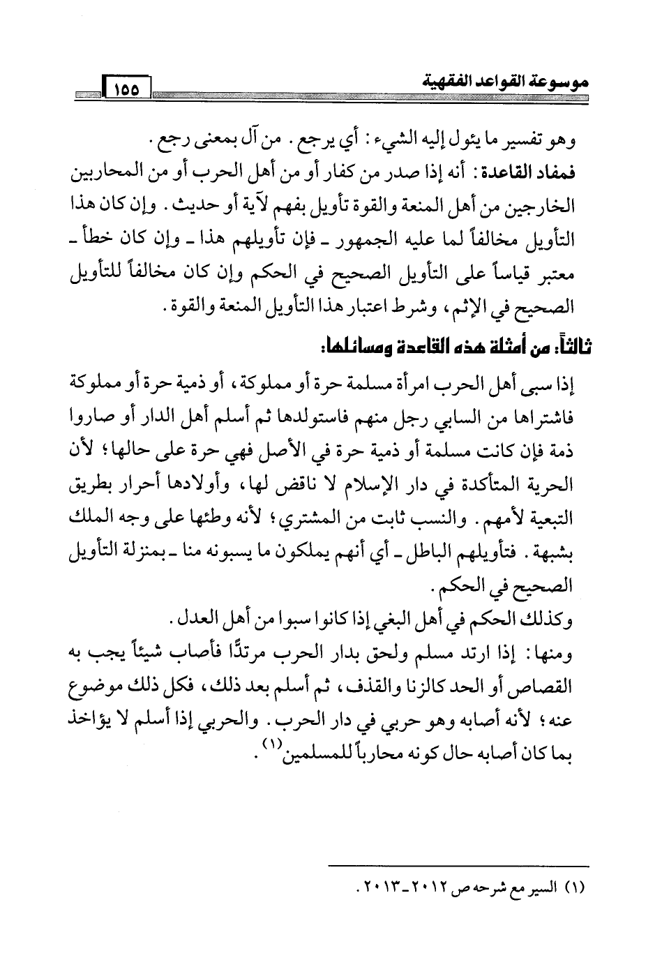فمفاد القاعدة: أنه إذا صدر من كفار أو من أهل الحرب أو من المحاربين الخارجين من أهل المنعة والقوة تأويل بفهم لآية أو حديث. وإن كان هذا التأويل مخالفاً لما عليه الجمهور - فإن تأويلهم هذا - وإن كان خطأ - معتبر قياساً على التأويل الصحيح في الحكم وإن كان مخالفاً للتأويل الصحيح في الإثم، وشرط اعتبار هذا التأويل المنعة والقوة.