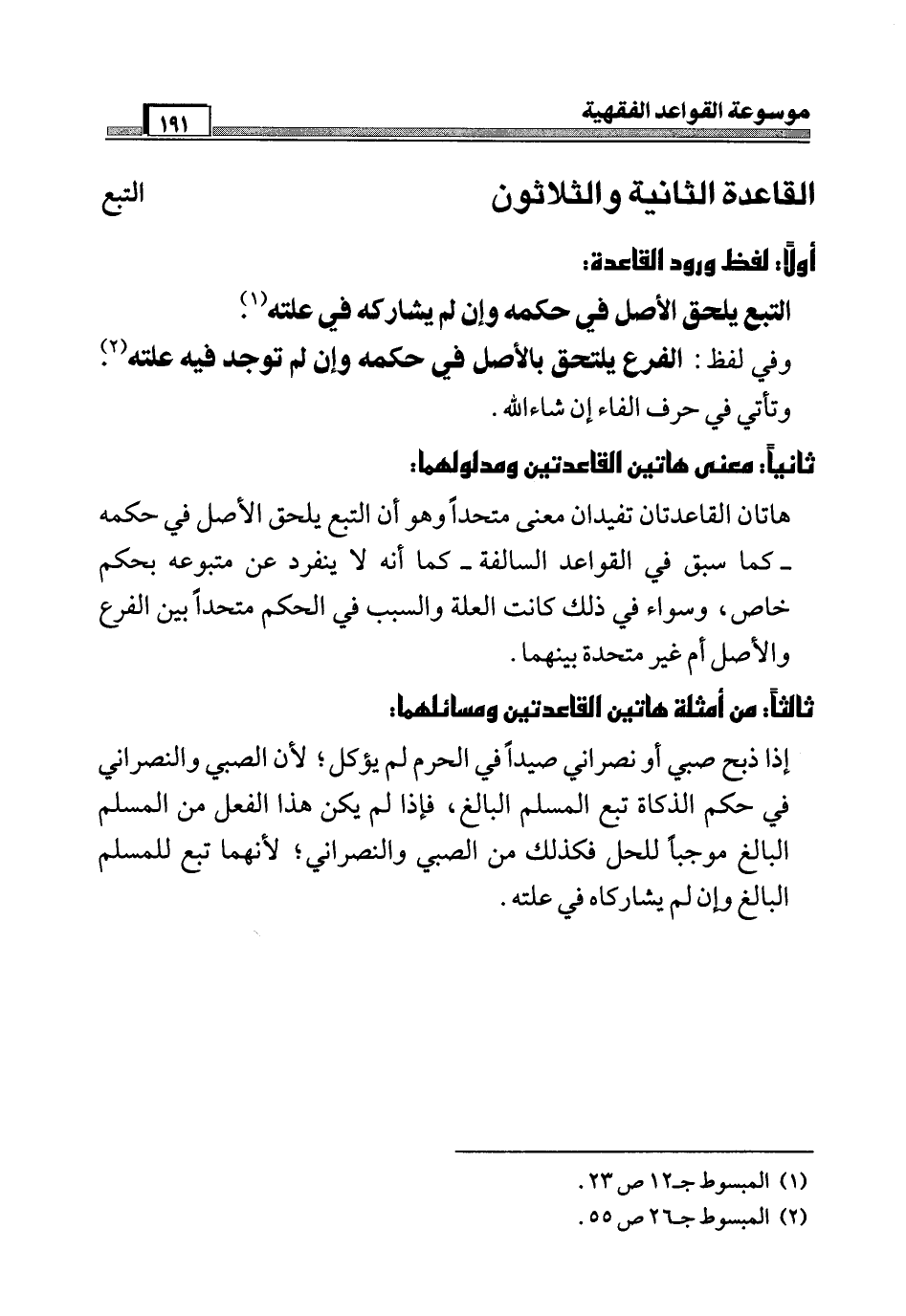 هاتان القاعدتان تفيدان معنى متحداً وهو أن التبع يلحق الأصل في حكمه - كما سبق في القواعد السالفة - كما أنه لا ينفرد عن متبوعه بحكم خاص، وسواء في ذلك كانت العلة والسبب في الحكم متحداً بين الفرع والأصل أم غير متحدة بينهما.