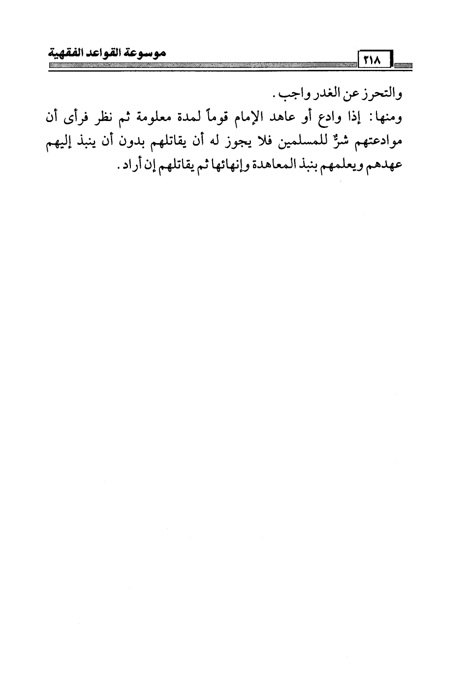 ومنها: إذا وادع أو عاهد الإمام قوماً لمدة معلومة ثم نظر فرأى أن موادعتهم شرٌّ للمسلمين فلا يجوز له أن يقاتلهم بدون أن ينبذ إليهم عهدهم ويعلمهم بنبذ المعاهدة وإنهائها ثم يقاتلهم إن أراد.