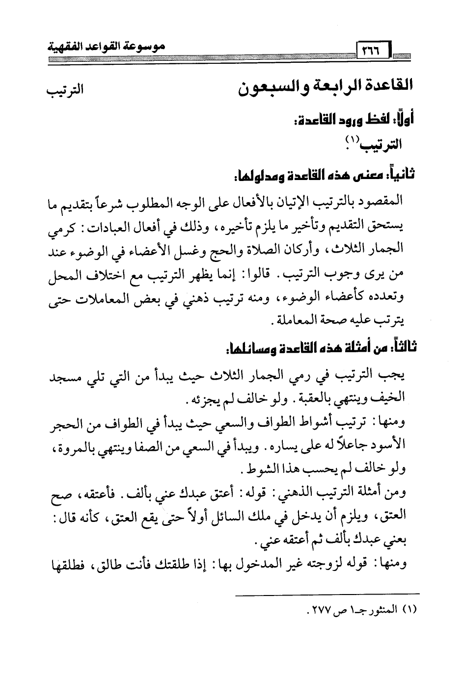 المقصود بالترتيب الإتيان بالأفعال على الوجه المطلوب شرعاً بتقديم ما يستحق التقديم وتأخير ما يلزم تأخيره، وذلك في أفعال العبادات: كرمي الجمار الثلاث، وأركان الصلاة والحج وغسل الأعضاء في الوضوء عند من يرى وجوب الترتيب. قالوا: إنما يظهر الترتيب مع اختلاف المحل وتعدده كأعضاء الوضوء، ومنه ترتيب ذهني في بعض المعاملات حتى يترتب عليه صحة المعاملة.