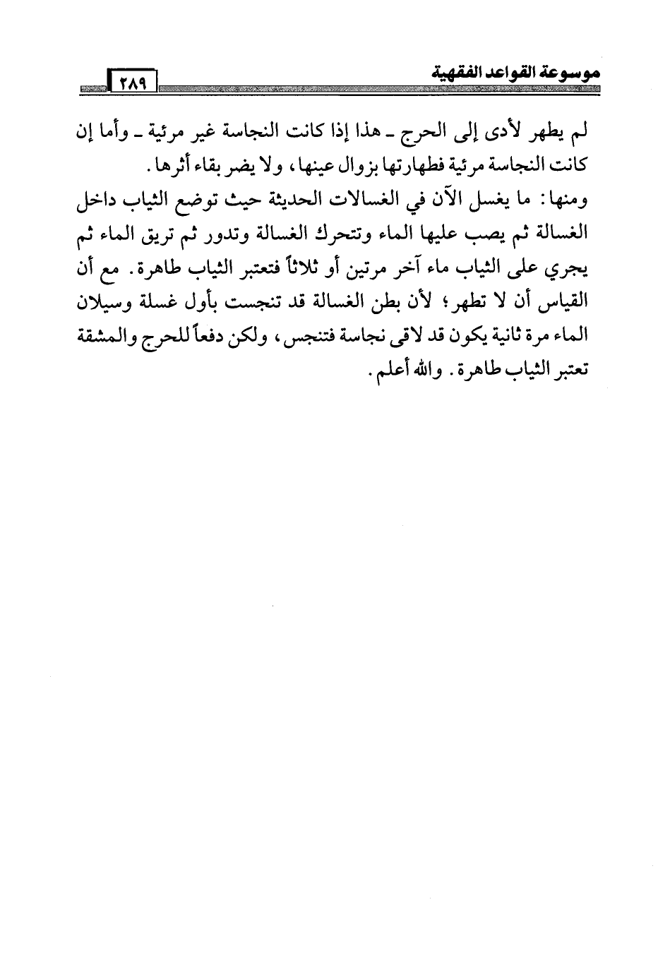 ومنها: ما يغسل الآن في الغسالات الحديثة حيث توضع الثياب داخل الغسالة ثم يصب عليها الماء وتتحرك الغسالة وتدور ثم تريق الماء ثم يجري على الثياب ماء آخر مرتين أو ثلاثاً فتعتبر الثياب طاهرة. مع أن القياس أن لا تطهر؛ لأن بطن الغسالة قد تنجست بأول غسلة وسيلان الماء مرة ثانية يكون قد لاقى نجاسة فتنجس, ولكن دفعاً للحرج والمشقة تعتبر الثياب طاهرة. والله أعلم.