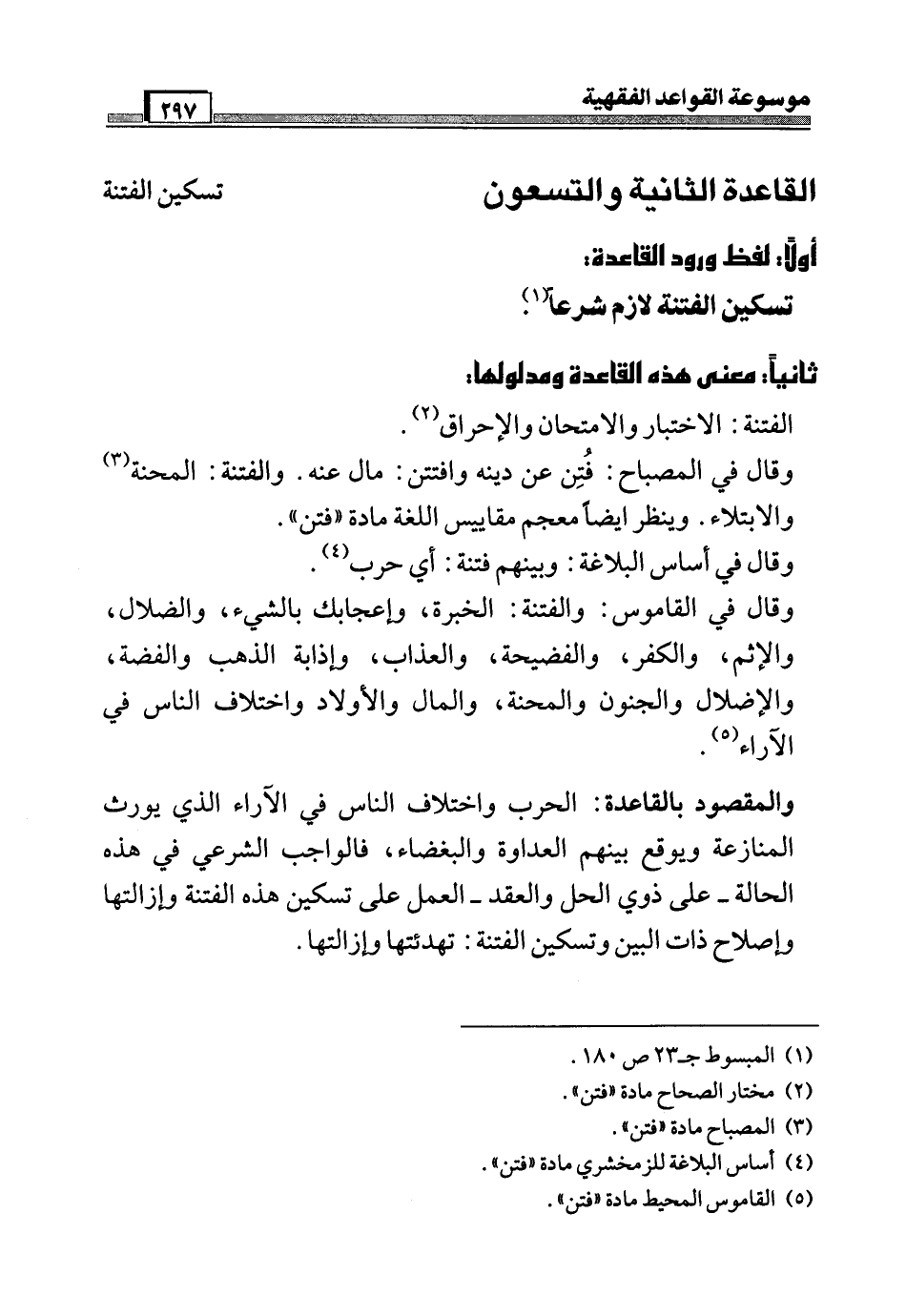 والمقصود بالقاعدة: الحرب واختلاف الناس في الآراء الذي يورث المنازعة ويوقع بينهم العداوة والبغضاء، فالواجب الشرعي في هذه الحالة - على ذوي الحل والعقد - العمل على تسكين هذه الفتنة وإزالتها وإصلاح ذات البين وتسكين الفتنة: تهدئتها وإزالتها.