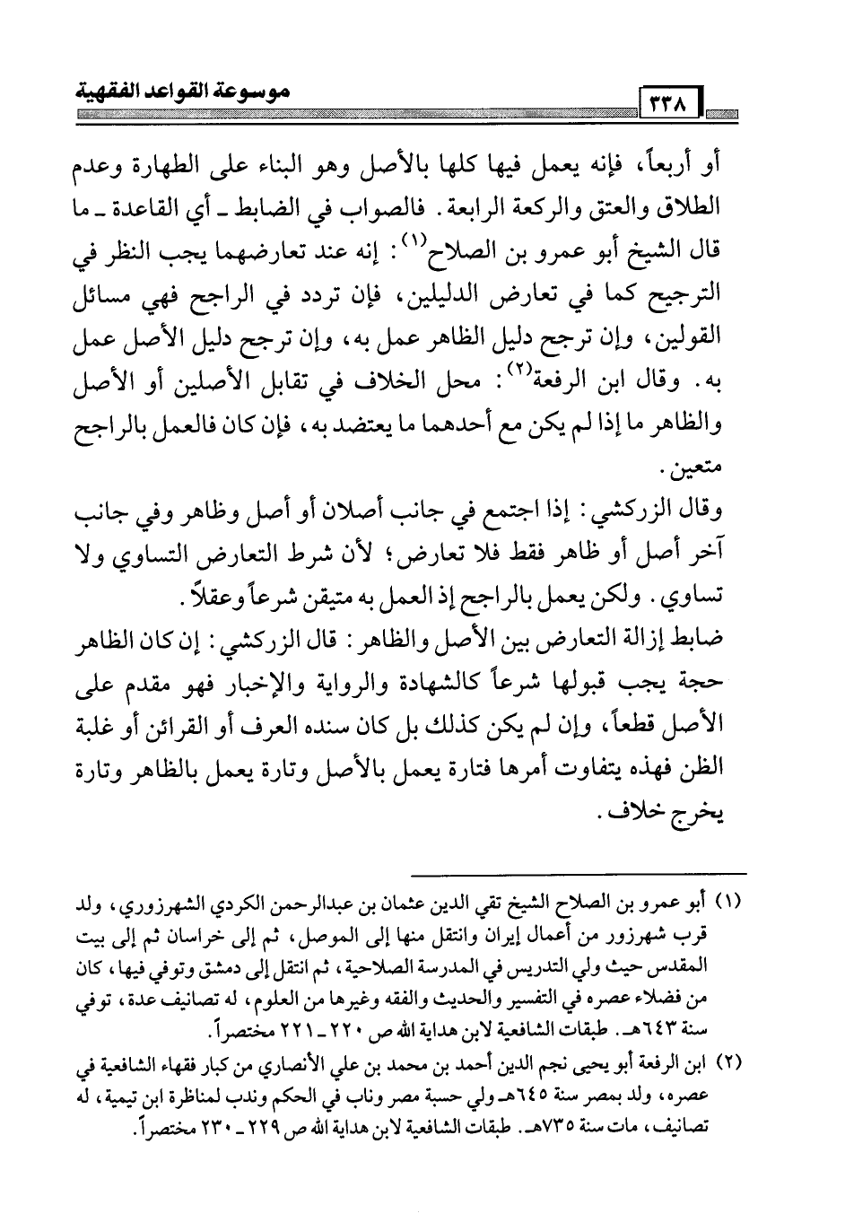 أو أربعاً، فإنه يعمل فيها كلها بالأصل وهو البناء على الطهارة وعدم الطلاق والعتق والركعة الرابعة. فالصواب في الضابط - أي القاعدة - ما قال الشيخ أبو عمرو بن الصلاح (¬1): إنه عند تعارضهما يجب النظر في الترجيح كما في تعارض الدليلين، فإن تردد في الراجح فهي مسائل القولين، وإن ترجح دليل الظاهر عمل به، وإن ترجح دليل الأصل عمل به. وقال ابن الرفعة (¬2): محل الخلاف في تقابل الأصلين أو الأصل والظاهر ما إذا لم يكن مع أحدهما ما يعتضد به، فإن كان فالعمل بالراجح متعين.