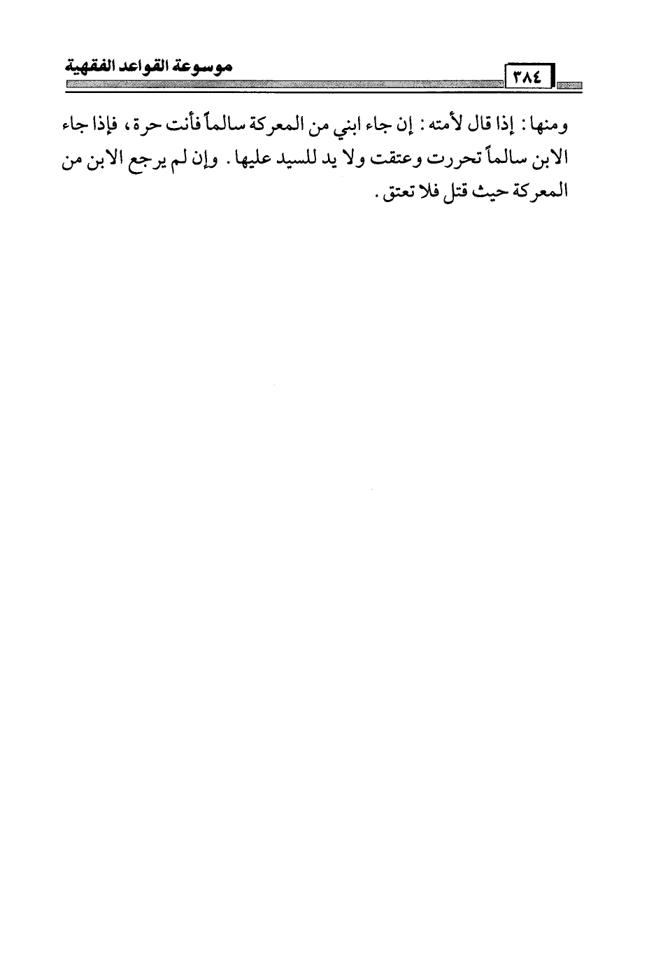 ومنها: إذا قال لأمته: إن جاء ابني من المعركة سالماً فأنت حرة، فإذا جاء الابن سالماً تحررت وعتقت ولا يد للسيد عليها. وإن لم يرجع الابن من المعركة حيث قتل فلا تعتق.