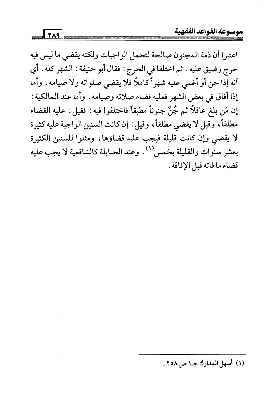 اعتبرا أن ذمة المجنون صالحة لتحمل الواجبات ولكنه يقضي ما ليس فيه حرج وضيق عليه. ثم اختلفا في الحرج: فقال أبو حنيفة: الشهر كله. أي أنه إذا جن أو أغمي عليه شهراً كاملاً فلا يقضي صلواته ولا صيامه. وأما إذا أفاق في بعض الشهر فعليه قضاء صلاته وصيامه. وأما عند المالكية: إن مَن بلغ عاقلاً ثم جُنَّ جنوناً مطبقاً فاختلفوا فيه: فقيل: عليه القضاء مطلقاً، وقيل لا يقضي مطلقاً، وقيل: إن كانت السنين الواجبة عليه كثيرة لا يقضي وإن كانت قليلة فيجب عليه قضاؤها، ومثلوا للسنين الكثيرة بعشر سنوات والقليلة بخمس (¬1). وعند الحنابلة كالشافعية لا يجب عليه قضاء ما فاته قبل الإفاقة.