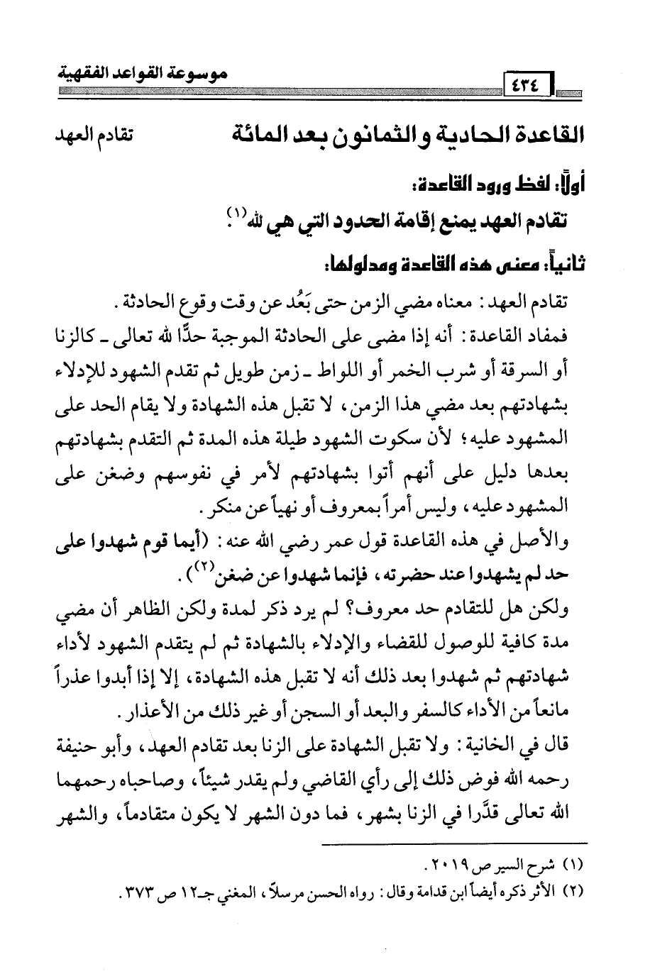 فمفاد القاعدة: أنه إذا مضى على الحادثة الموجبة حدًّا لله تعالى - كالزنا أو السرقة أو شرب الخمر أو اللواط - زمن طويل ثم تقدم الشهود للإدلاء بشهادتهم بعد مضي هذا الزمن، لا تقبل هذه الشهادة ولا يقام الحد على المشهود عليه؛ لأن سكوت الشهود طيلة هذه المدة ثم المتقدم بشهادتهم بعدها دليل على أنهم أتوا بشهادتهم لأمر في نفوسهم وضغن على المشهود عليه، وليس أمراً بمعروف أو نهياً عن منكر.