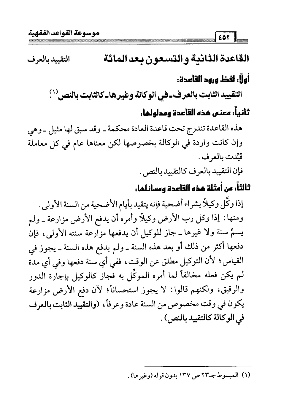 القاعدة الثانية والتسعون بعد المائة [التقييد بالعرف]