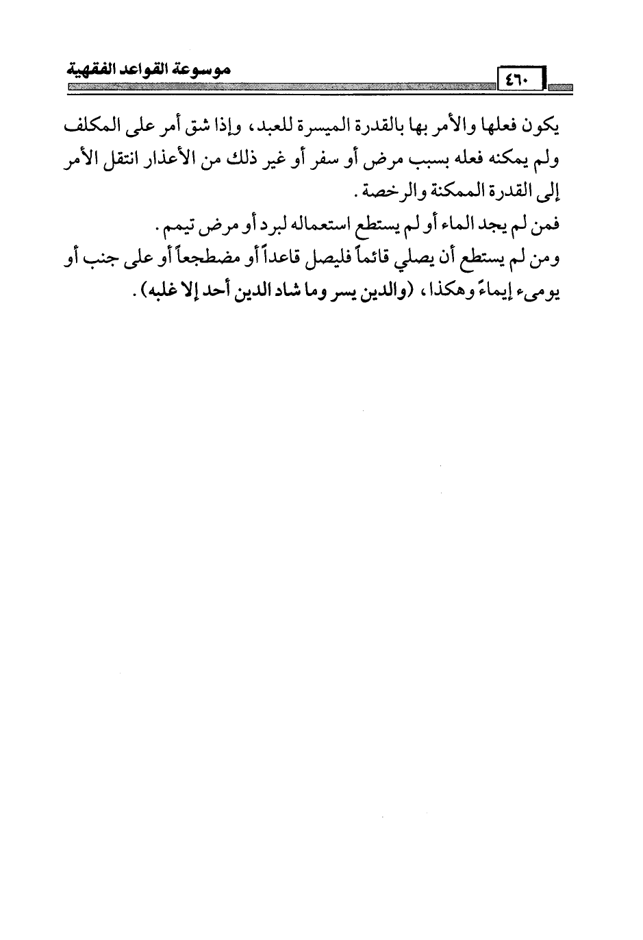 يكون فعلها والأمر بها بالقدرة الميسرة للعبد، وإذا شق أمر على المكلف ولم يمكنه فعله بسبب مرض أو سفر أو غير ذلك من الأعذار انتقل الأمر إلى القدرة الممكنة والرخصة.