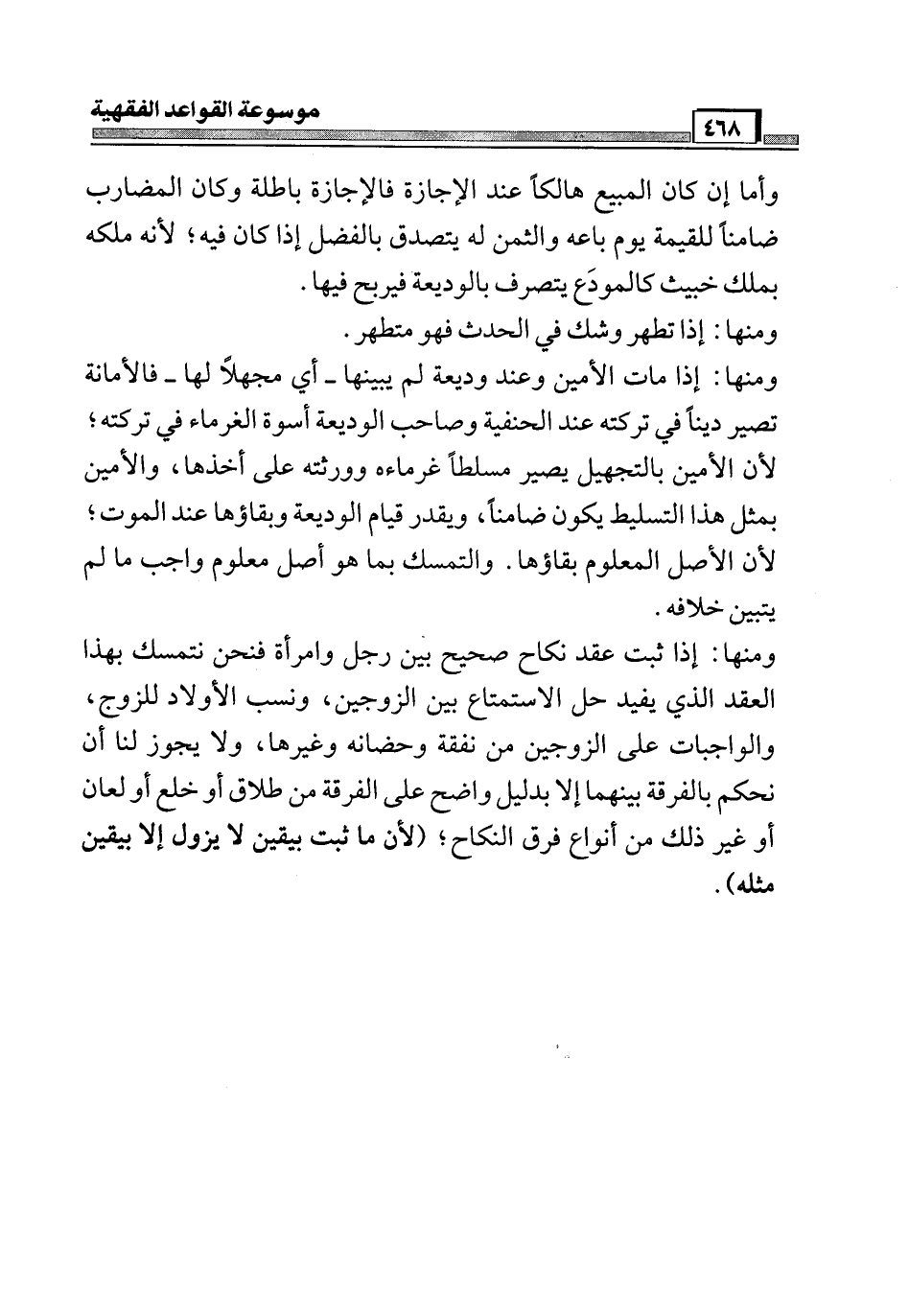 ومنها: إذا ثبت عقد نكاح صحيح بين رجل وامرأة فنحن نتمسك بهذا العقد الذي يفيد حل الاستمتاع بين الزوجين، ونسب الأولاد للزوج، والواجبات على الزوجين من نفقة وحضانة وغيرها، ولا يجوز لنا أن نحكم بالفرقة بينهما إلا بدليل واضح على الفرقة من طلاق أو خلع أو لعان أو غير ذلك من أنواع فرق النكاح؛ (لأن ما ثبت بيقين لا يزول إلا بيقين مثله).