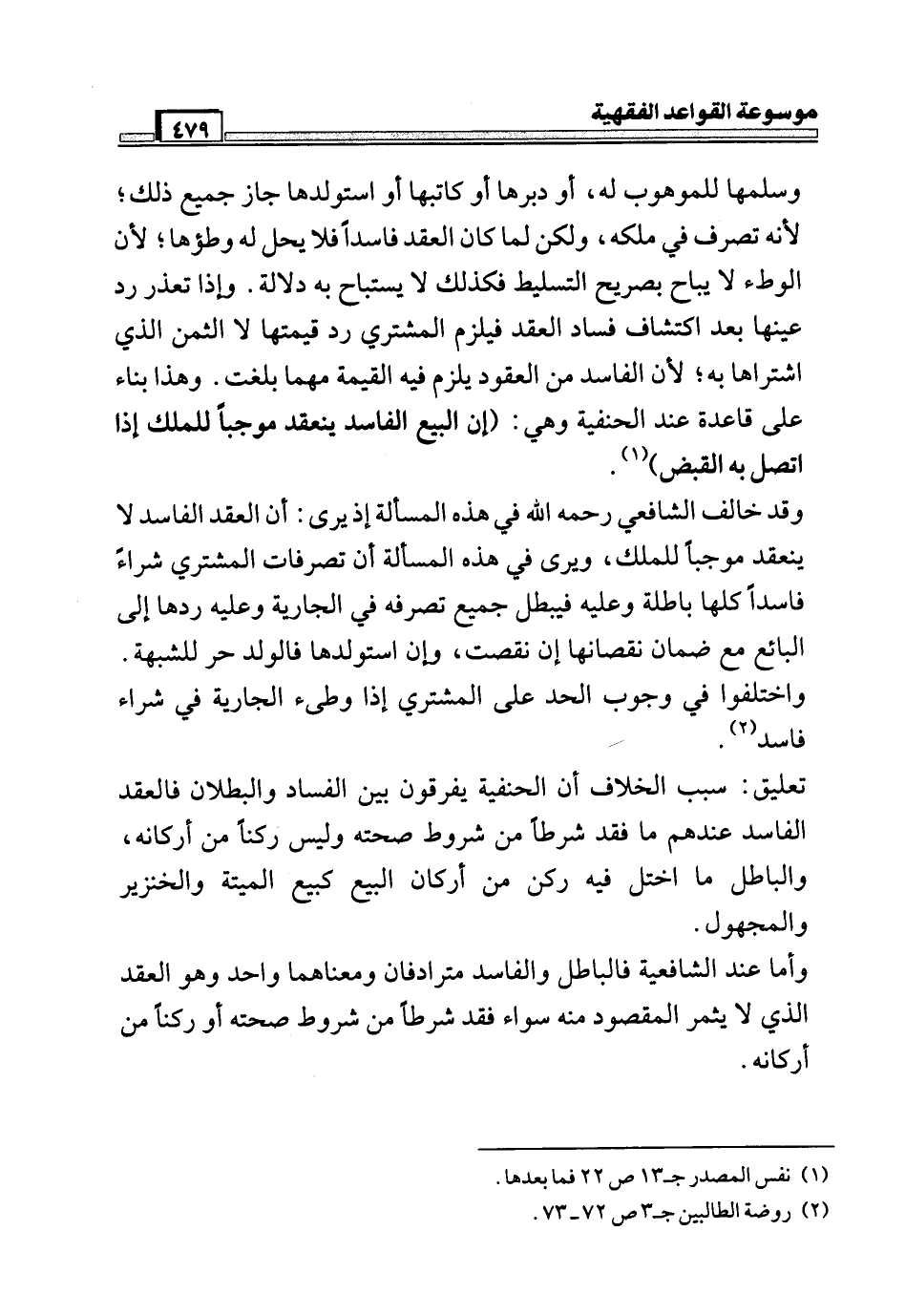 وسلمها للموهوب له، أو دبرها أو كاتبها أو استولدها جاز جميع ذلك؛ لأنه تصرف في ملكه، ولكن لما كان العقد فاسداً فلا يحل له وطؤها؛ لأن الوطء لا يباح بصريح التسليط فكذلك لا يستباح به دلالة. وإذا تعذر رد عينها بعد اكتشاف فساد العقد فيلزم المشتري رد قيمتها لا الثمن الذي اشتراها به؛ لأن الفاسد من العقود يلزم فيه القيمة مهما بلغت. وهذا بناء على قاعدة عند الحنفية وهي: (إن البيع الفاسد ينعقد موجباً للملك إذا اتصل به القبض) (¬1).