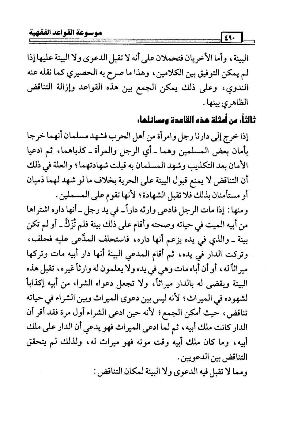البينة، وأما الأخريان فتحملان على أنه لا تقبل الدعوى ولا البينة عليها إذا لم يمكن التوفيق بين الكلامين، وهذا ما صرح به الحصيري كما نقله عنه الندوي، وعلى ذلك يمكن الجمع بين هذه القواعد وإزالة التناقض الظاهري بينها.