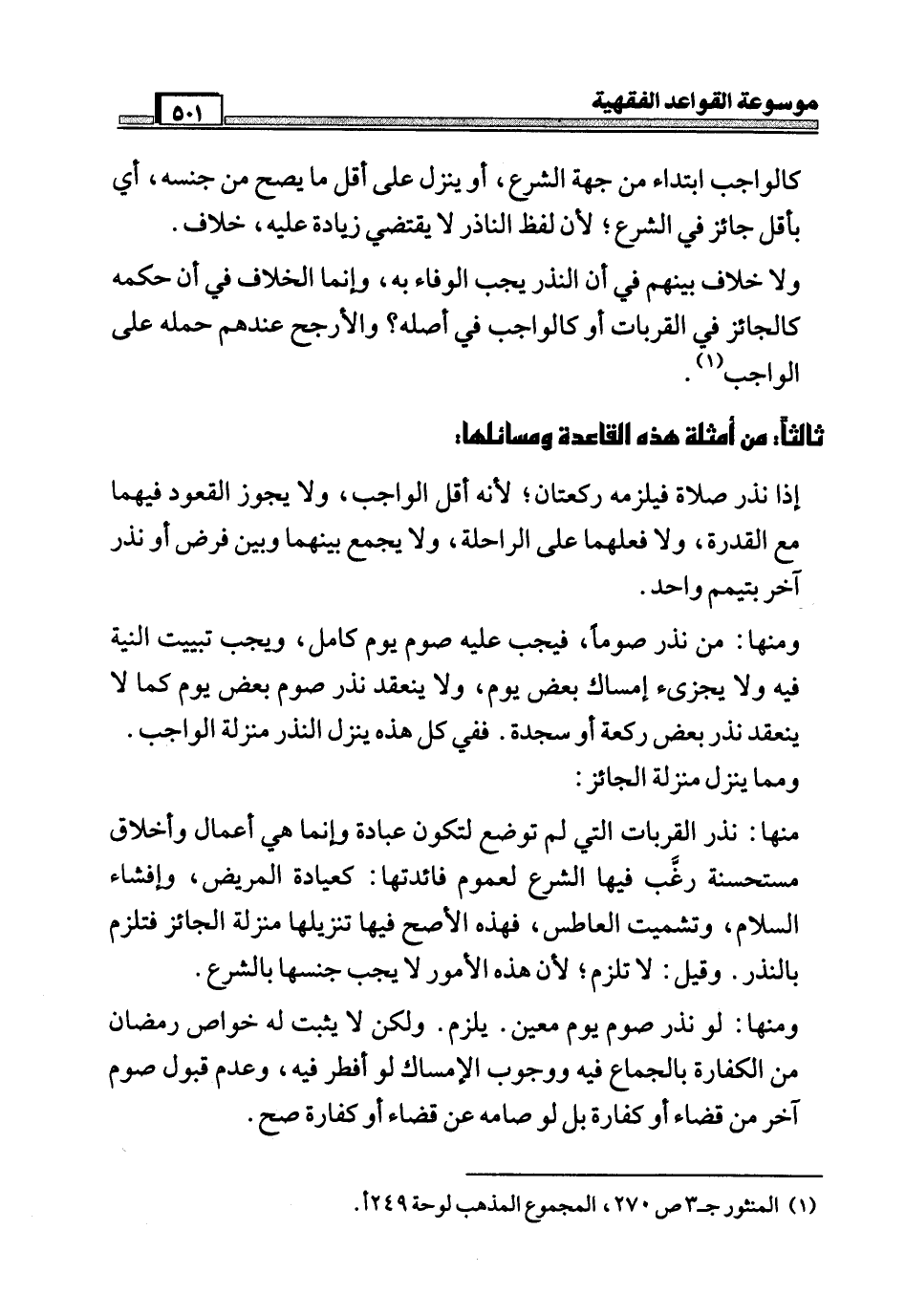 ومنها: من نذر صوماً، فيجب عليه صوم يوم كامل، ويجب تبييت النية فيه ولا يجزئ إمساك بعض يوم، ولا ينعقد نذر صوم بعض يوم كما لا ينعقد نذر بعض ركعة أو سجدة. ففي كل هذه ينزل النذر منزلة الواجب. ومما ينزل منزلة الجائز: