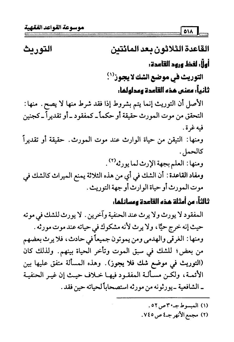 ومفاد القاعدة: أن الشك في أي من هذه الثلاثة يمنع الميراث كالشك في موت المورث أو حياة الوارث أو جهة التوريث.