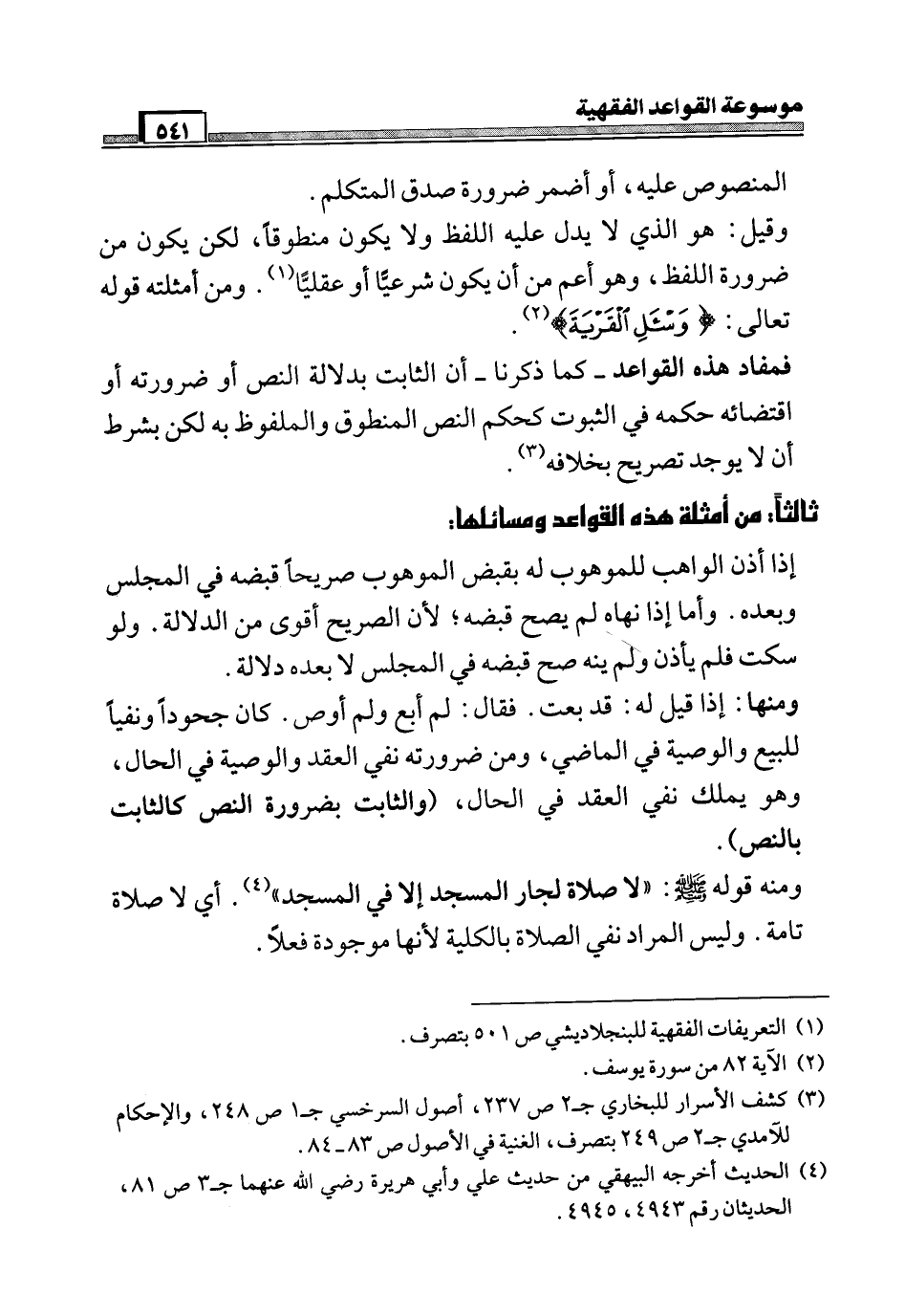 فمفاد هذه القواعد - كما ذكرنا - أن الثابت بدلالة النص أو ضرورته أو اقتضائه حكمه في الثبوت كحكم النص المنطوق والملفوظ به لكن بشرط أن لا يوجد تصريح بخلافه (¬3).