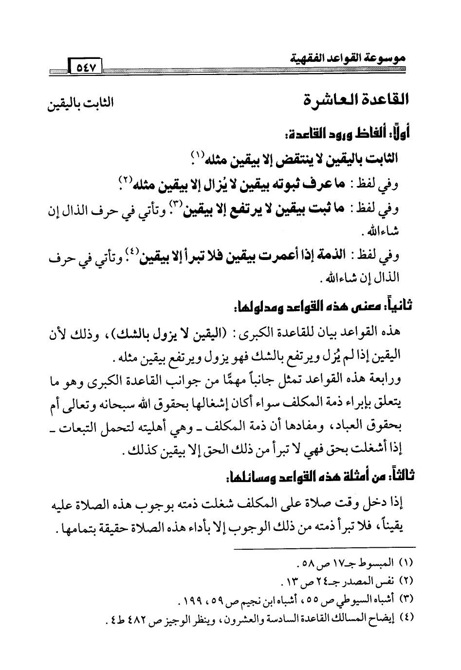 ورابعة هذه القواعد تمثل جانباً مهمًّا من جوانب القاعدة الكبرى وهو ما يتعلق بإبراء ذمة المكلف سواء أكان إشغالها بحقوق الله سبحانه وتعالى أم بحقوق العباد، ومفادها أن ذمة المكلف - وهي أهليته لتحمل التبعات - إذا أشغلت بحق فهي لا تبرأ من ذلك الحق إلا بيقين كذلك.