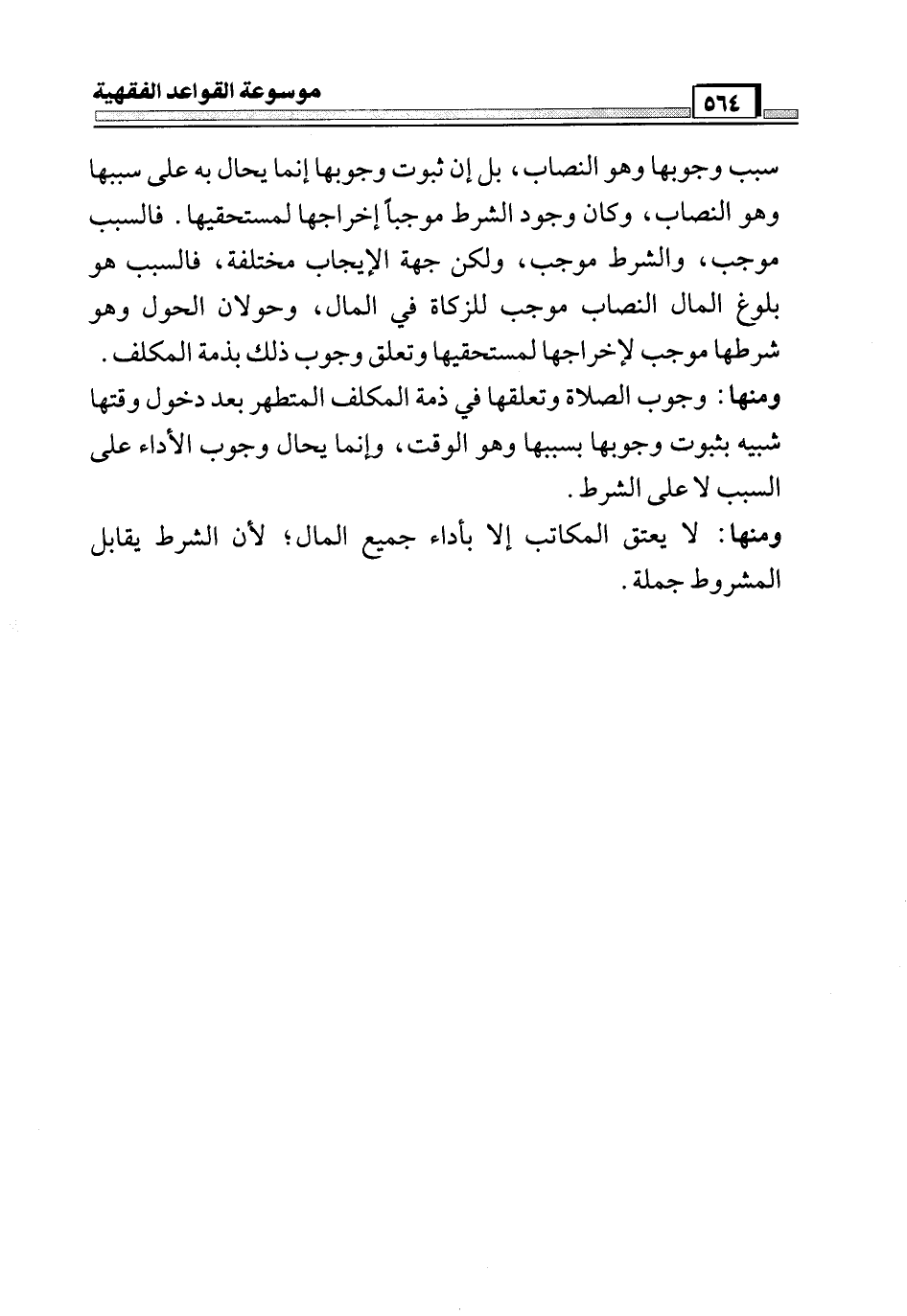 سبب وجوبها وهو النصاب، بل إن ثبوت وجوبها إنما يحال به على سببها وهو النصاب، وكان وجود الشرط موجباً إخراجها لمستحقيها. فالسبب موجب، والشرط موجب، ولكن جهة الإيجاب مختلفة، فالسبب هو بلوغ المال النصاب موجب للزكاة في المال، وحولان الحول وهو شرطها موجب لإخراجها لمستحقيها وتعلق وجوب ذلك بذمة المكلف.