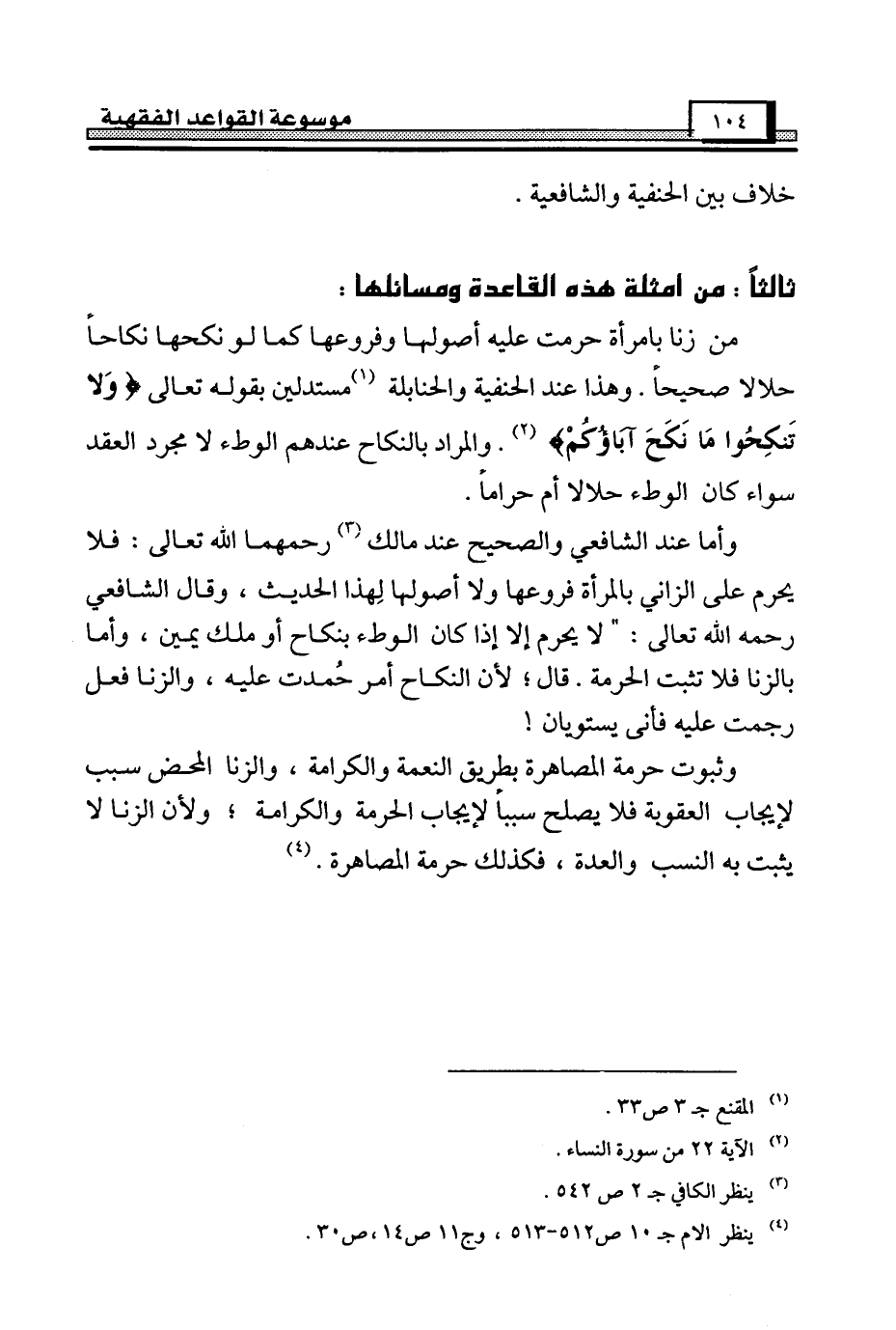 من زنا بامرأة حرمت عليه أصولها وفروعها كما لو نكحها نكاحاً حلالا صحيحاً. وهذا عند الحنفية والحنابلة (¬1) مستدلين بقوله تعالى {وَلَا تَنْكِحُوا مَا نَكَحَ آبَاؤُكُمْ} (¬2). والمراد بالنكاح عندهم الوطء لا مجرد العقد سواء كان الوطء حلالا أم حراماً.