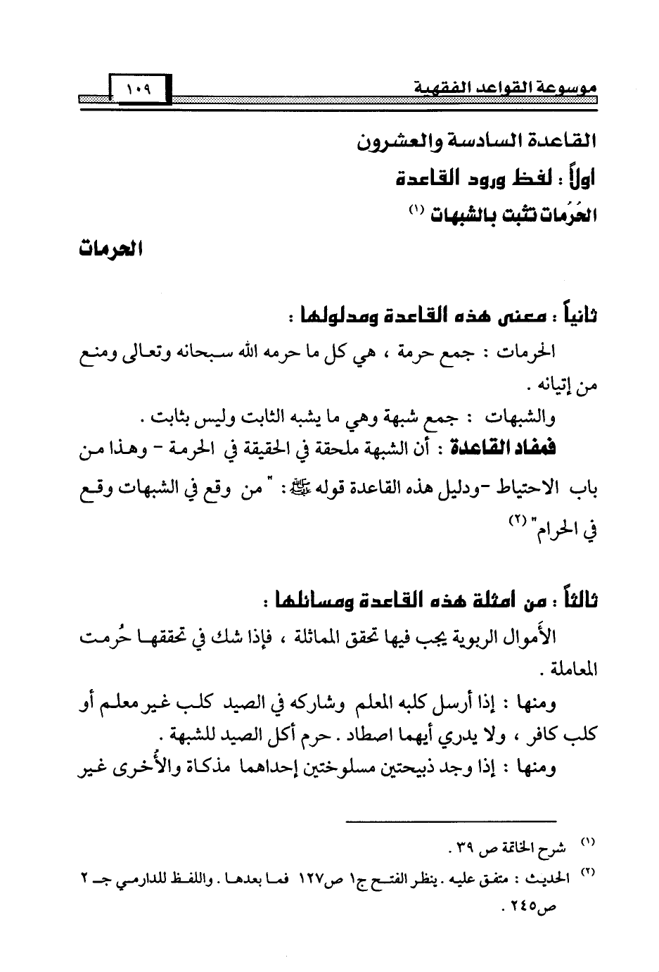 فمفاد القاعدة: أن الشبهة ملحقة في الحقيقة في الحرمة - وهذا من باب الاحتياط - ودليل هذه القاعدة قوله - صلى الله عليه وسلم -: "من وقع في الشبهات وقع في الحرام" (¬2)