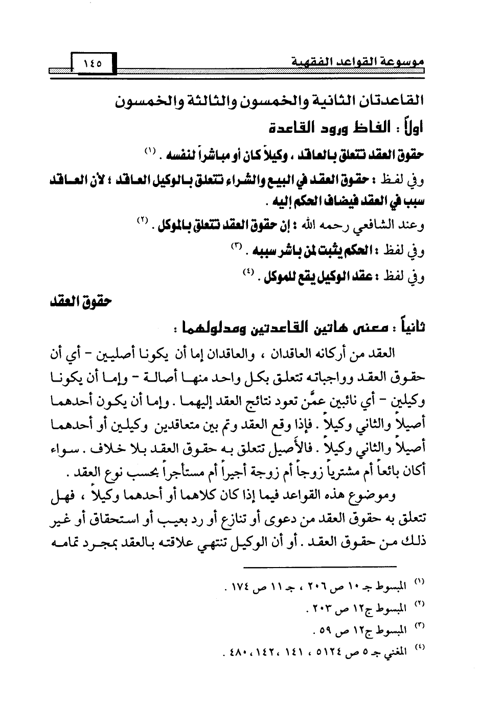 وموضوع هذه القواعد فيما إذا كان كلاهما أو أحدهما وكيلاً، فهل تتعلق به حقوق العقد من دعوى أو تنازع أو رد بعيب أو استحقاق أو غير ذلك من حقوق العقد. أو أن الوكيل تنتهي علاقته بالعقد بمجرد تمامه