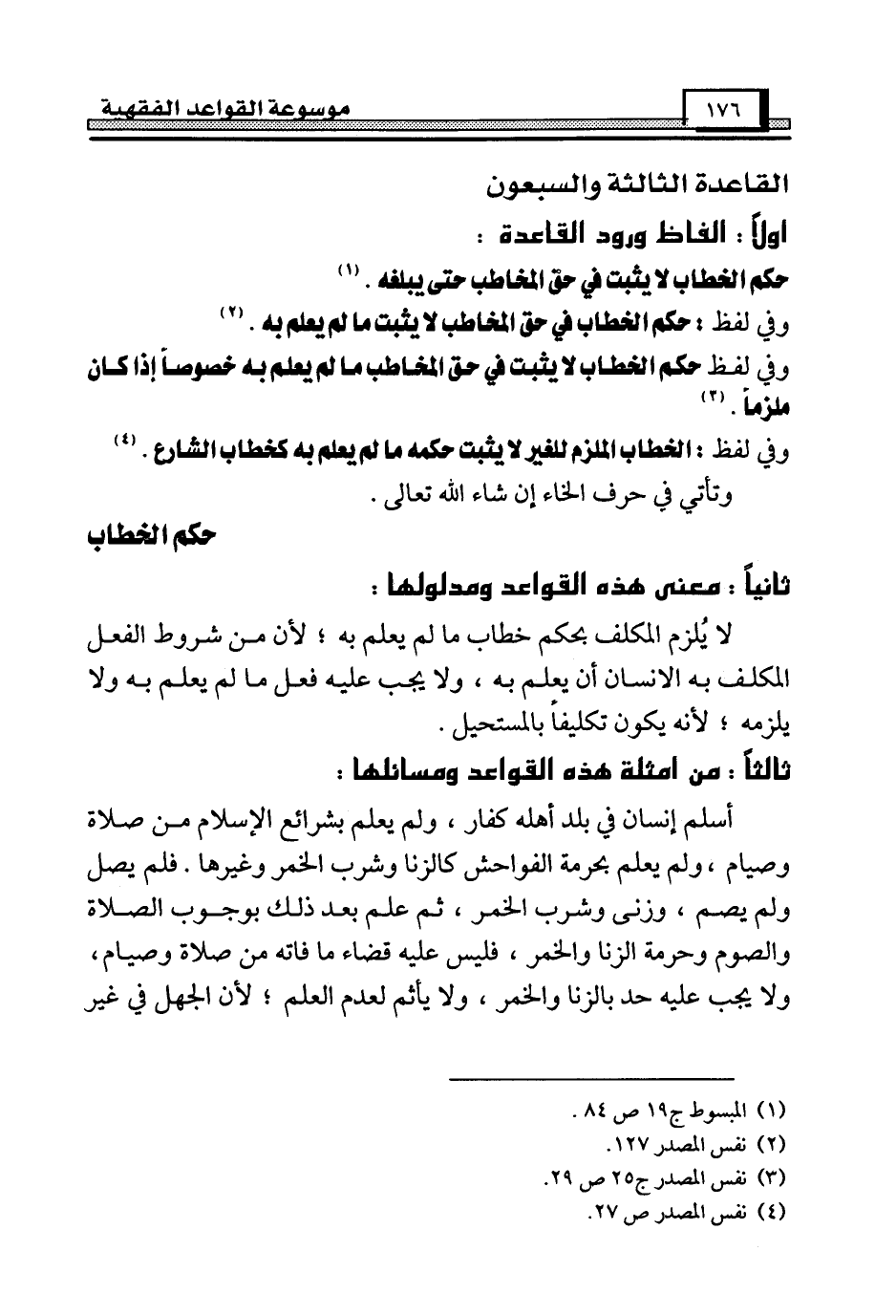 وفي لفظ: الخطاب الملزم للغير لا يثبت حكمه ما لم يعلم به كخطاب الشارع. (¬4) وتأتي في حرف الخاء إن شاء الله تعالى.