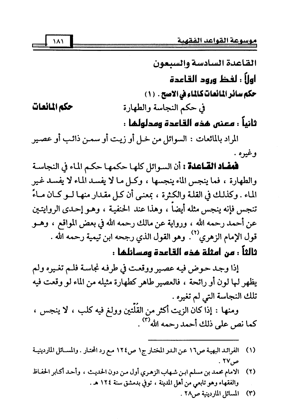 فمفاد القاعدة: أن السوائل كلها حكمها حكم الماء في النجاسة والطهارة، فما ينجس الماء ينجسها، وكل ما لا يفسد الماء لا يفسد غير الماء. وكذلك في القلة والكثرة، بمعنى أن كل مقدار منها لو كان ماءً تنجس فإنه ينجس مثله أيضاً، وهذا عند الحنفية، وهو إحدى الروايتين عن أحمد رحمه الله، ورواية عن مالك رحمه الله في بعض المواقع، وهو قول الإِمام الزهري (¬2). وهو القول الذي رجحه ابن تيمية رحمه الله.