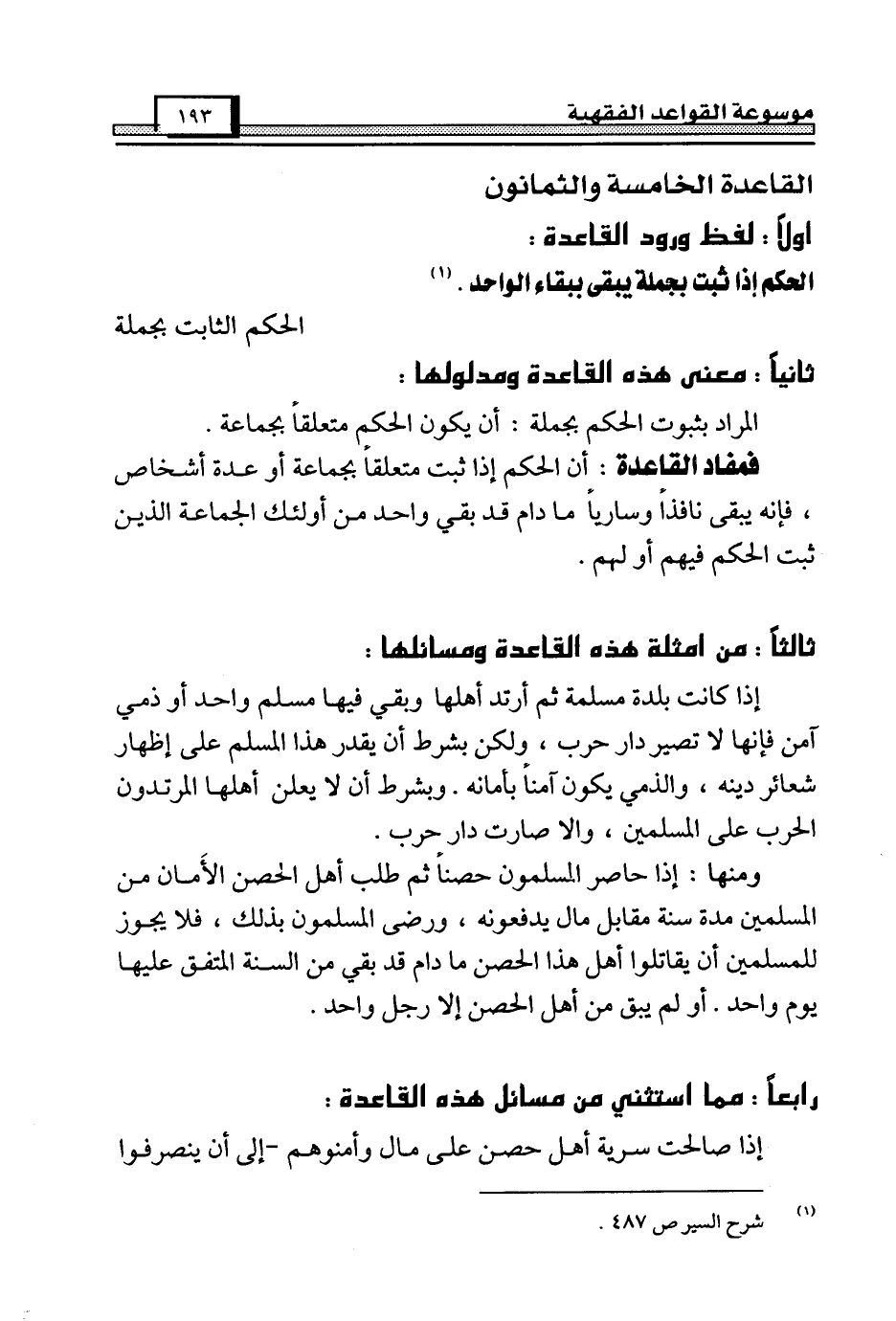 فمفاد القاعدة: أن الحكم إذا ثبت متعلقاً بجماعة أو عدة أشخاص، فإنه يبقى نافذاً وسارياً ما دام قد بقي واحد من أولئك الجماعة الذين ثبت الحكم فيهم أو لهم.