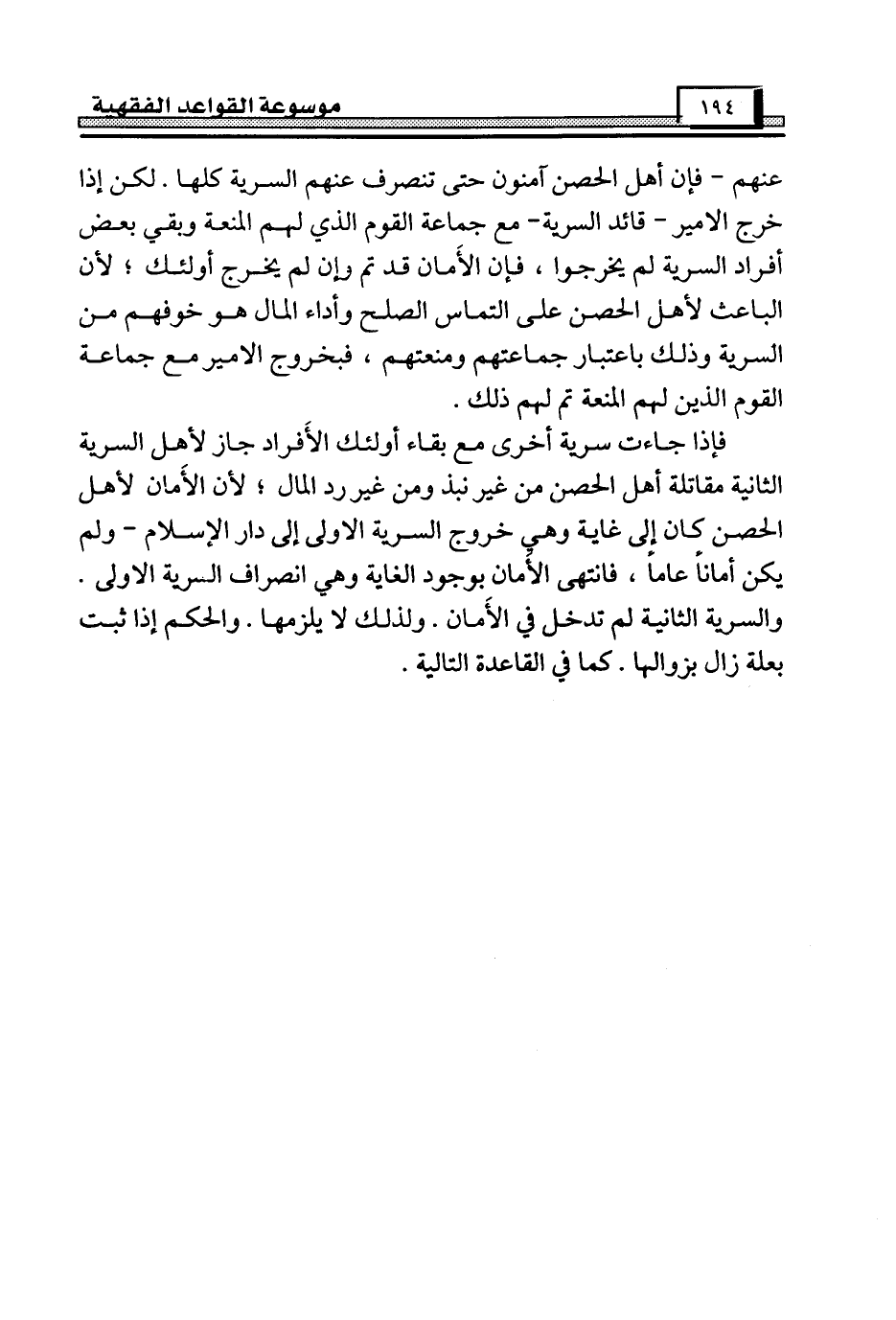 فإذا جاءت سرية أخرى مع بقاء أولئك الأَفراد جاز لأهل السرية الثانية مقاتلة أهل الحصن من غير نبذ ومن غير رد المال؛ لأن الأَمان لأهل الحصن كان إلى غاية وهي خروج السرية الأولى إلى دار الإِسلام - ولم يكن أماناً عاماً، فانتهى الأمان بوجود الغاية وهي انصراف السرية الأولى. والسرية الثانية لم تدخل في الأَمان. ولذلك لا يلزمها. والحكم إذا ثبت بعلة زال بزوالها. كما في القاعدة التالية.