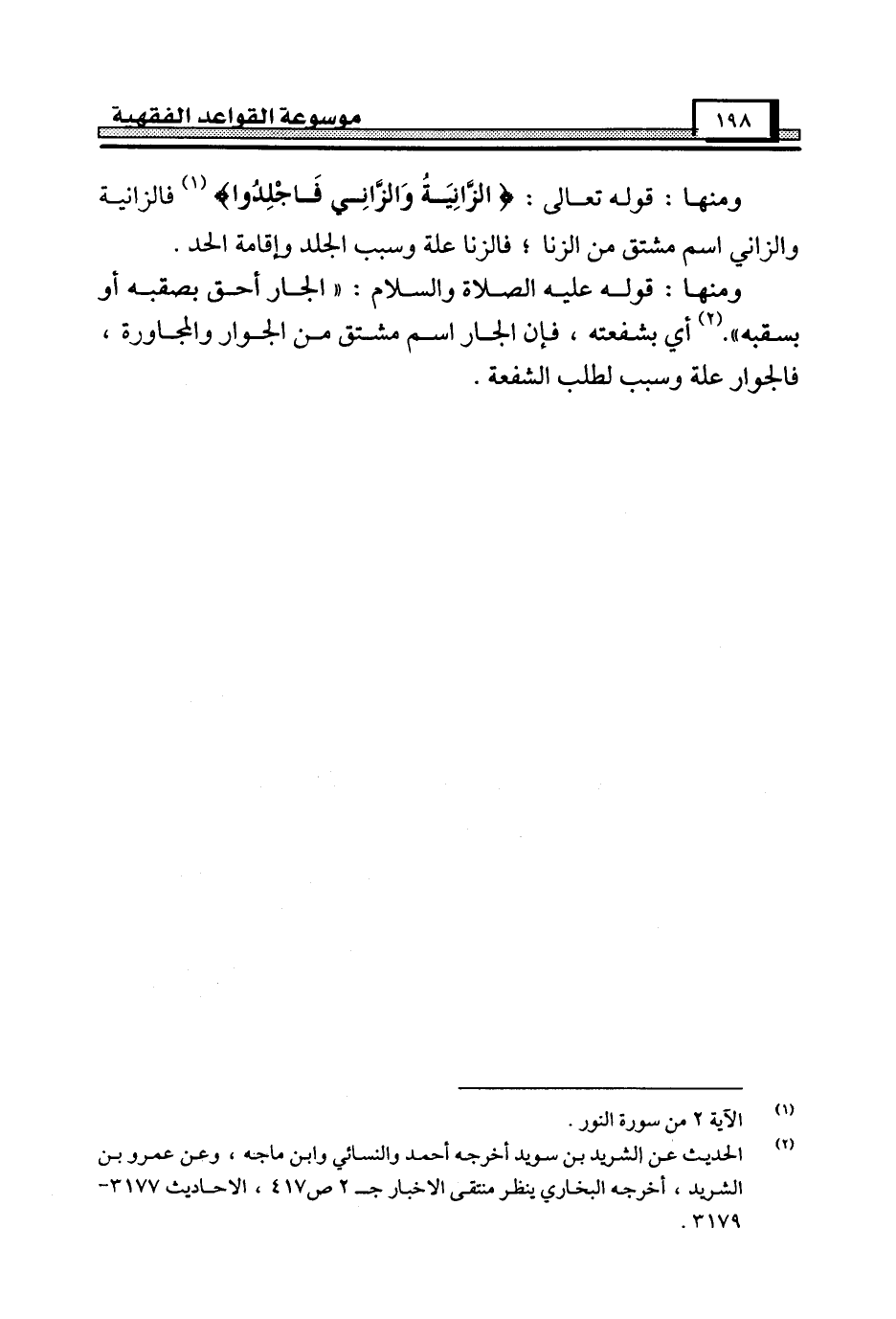 ومنها: قوله عليه الصلاة والسلام: "الجار أحق بصقبه أو بسقبه". (¬2) أي بشفعته، فإن الجار اسم مشتق من الجوار والمجاورة، فالجوار علة وسبب لطلب الشفعة.