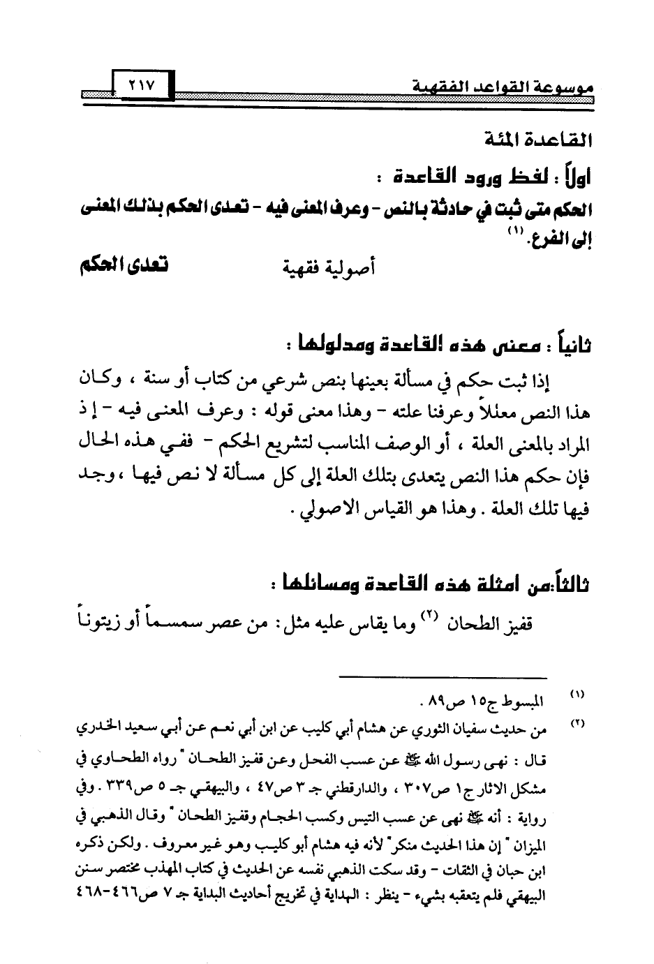 الحكم متى ثبت في حادثة بالنص - وعرف المعنى فيه - تعدى الحكم بذلك المعنى إلى الفرع. (¬1) أصولية فقهية