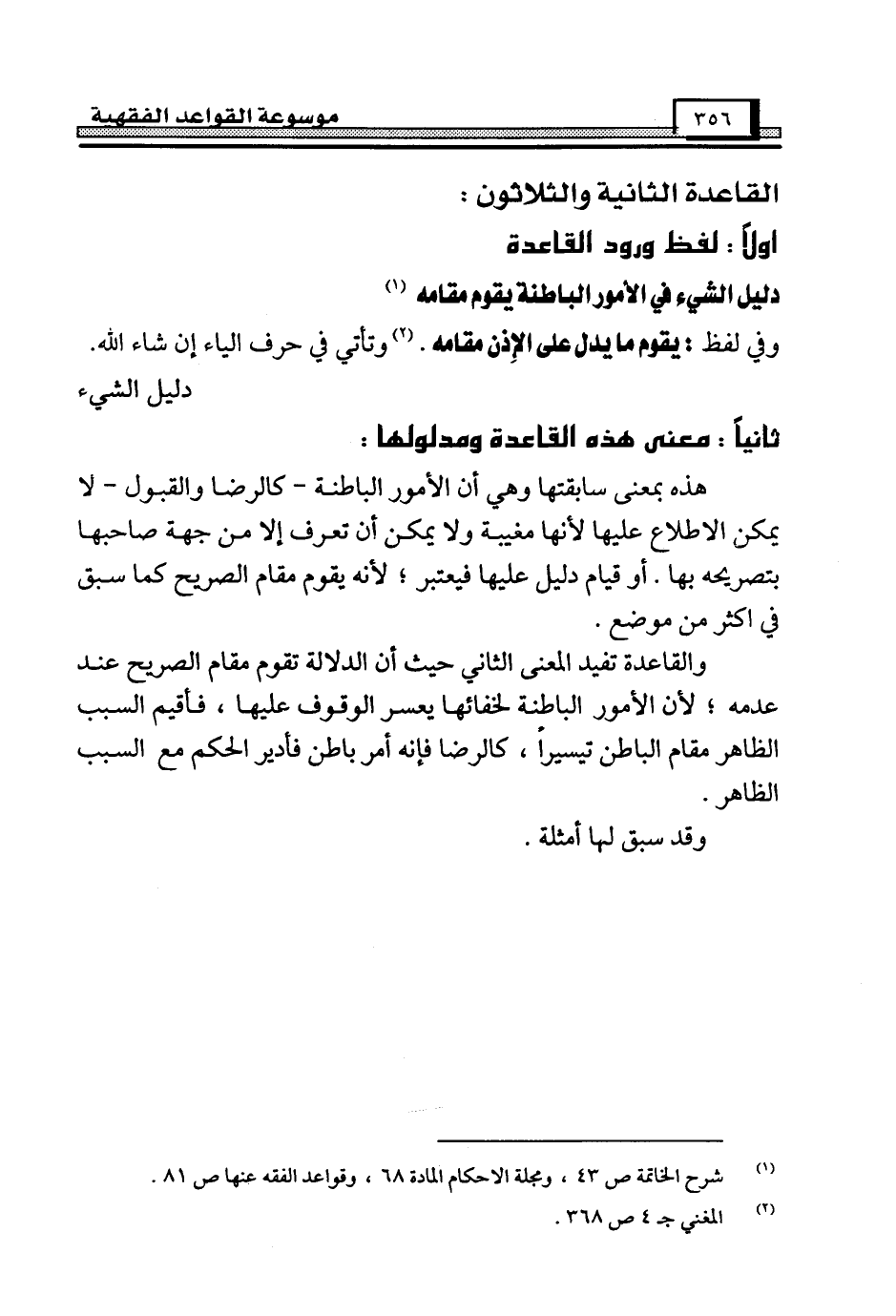 والقاعدة تفيد المعنى الثاني حيث أن الدلالة تقوم مقام الصريح عند عدمه؛ لأن الأمور الباطنة لخفائها يعسر الوقوف عليها، فأقيم السبب الظاهر مقام الباطن تيسيراً، كالرضا فإنه أمر باطن فأدير الحكم مع السبب الظاهر.