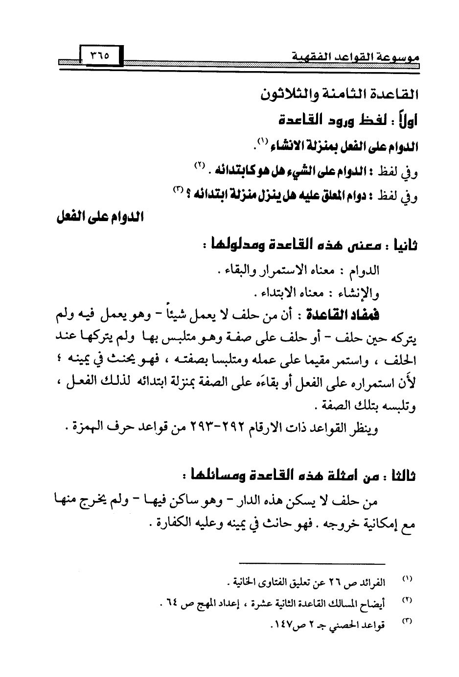 فمفاد القاعدة: أن من حلف لا يعمل شيئاً - وهو يعمل فيه ولم يتركه حين حلف - أو حلف على صفة وهو متلبس بها ولم يتركها عند الحلف، واستمر مقيما على عمله ومتلبسا بصفته، فهو يحنث في يمينه؛ لأَن استمراره على الفعل أو بقاءَه على الصفة بمنزلة ابتدائه لذلك الفعل، وتلبسه بتلك الصفة.