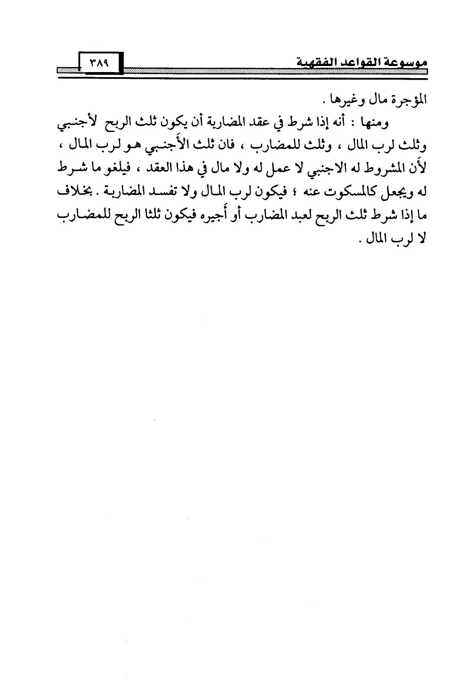 ومنها: أنه إذا شرط في عقد المضاربة أن يكون ثلث الربح لأجنبي وثلث لرب المال، وثلث للمضارب، فإن ثلث الأَجنبي هو لرب المال، لأَن المشروط له الأجنبي لا عمل له ولا مال في هذا العقد، فيلغو ما شرط له ويجعل كالمسكوت عنه؛ فيكون لرب المال ولا تفسد المضاربة. بخلاف ما إذا شرط ثلث الربح لعبد المضارب أو أَجيره فيكون ثلثا الربح للمضارب لا لرب المال.