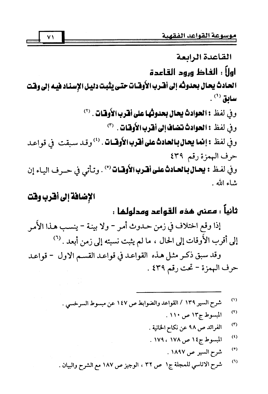 وفي لفظ: إنما يحال بالحادث على أقرب الأَوقات. (¬4) وقد سبقت في قواعد حرف الهمزة رقم 439