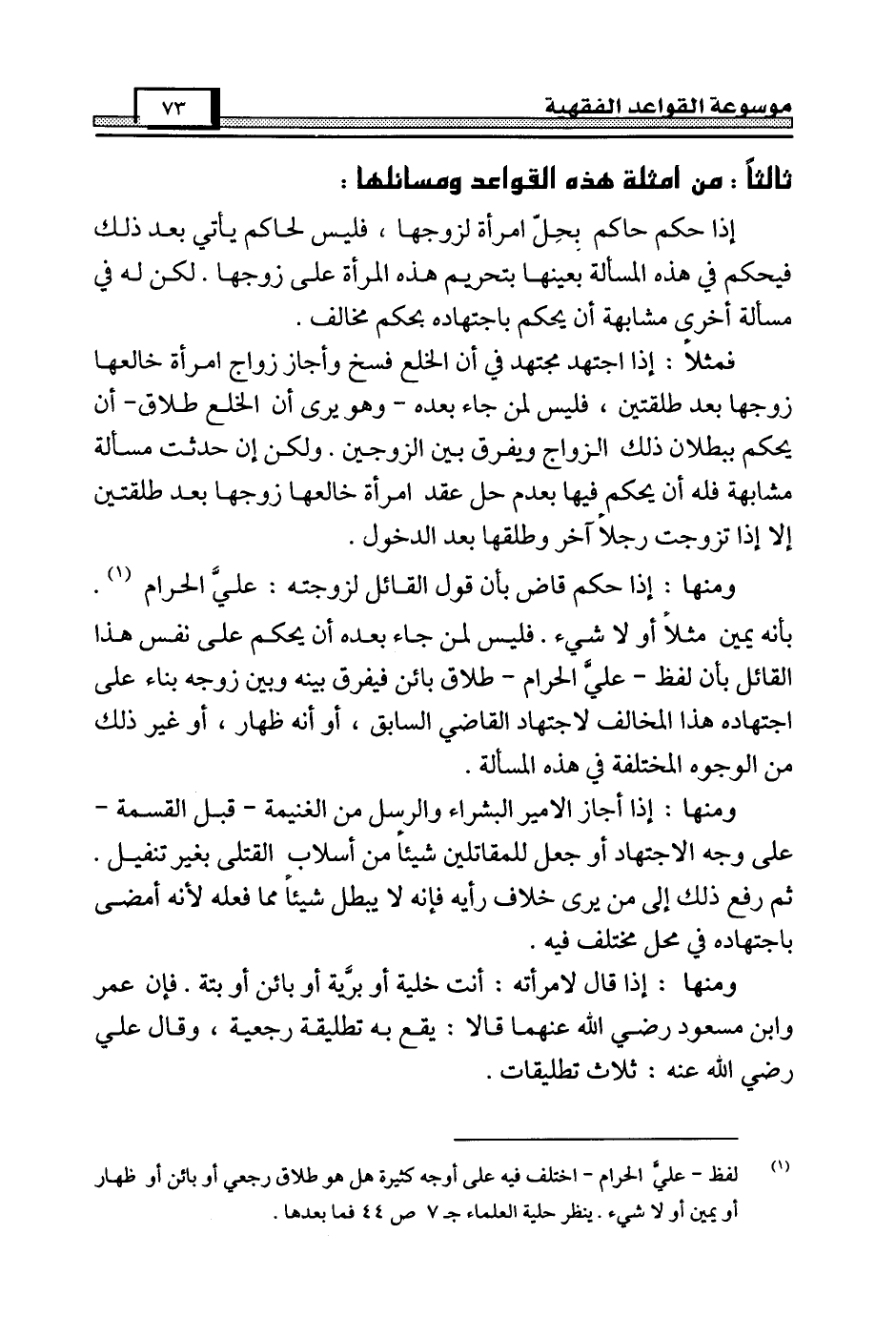 (¬1) لفظ - عليَّ الحرام - اختلف فيه على أوجه كثيرة هل هو طلاق رجعي أو بائن أو ظهار أو يمين أو لا شيء. ينظر حلية العلماء جـ 7 ص 44 فما بعدها.