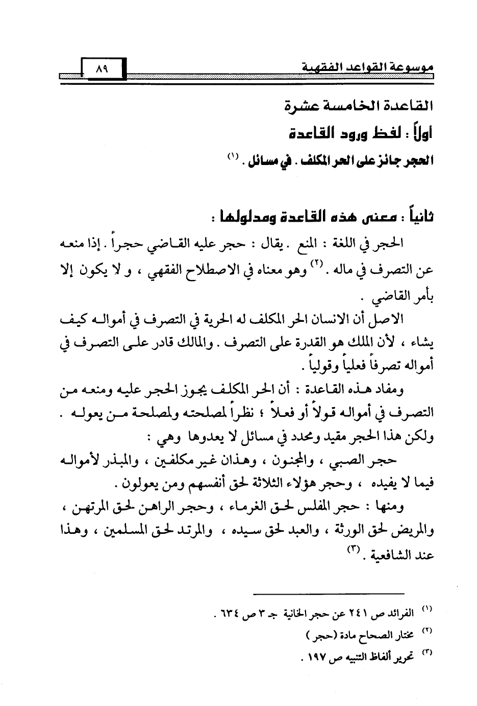 ومفاد هذه القاعدة: أن الحر المكلف يجوز الحجر عليه ومنعه من التصرف في أمواله قولاً أو فعلاً؛ نظراً لمصلحته ولمصلحة من يعوله. ولكن هذا الحجر مقيد ومحدد في مسائل لا يعدوها وهي: