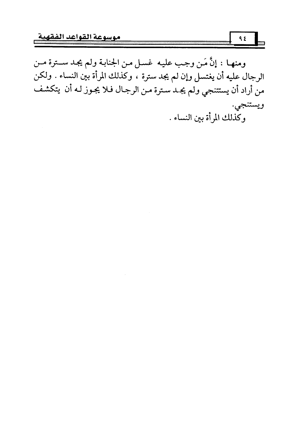 ومنها: إنَّ مَن وجب عليه غسل من الجنابة ولم يجد سترة من الرجال عليه أن يغتسل وإن لم يجد سترة، وكذلك المرأة بين النساء. ولكن من أراد أن يستنجي ولم يجد سترة من الرجال فلا يجوز له أن يتكشف ويستنجي.