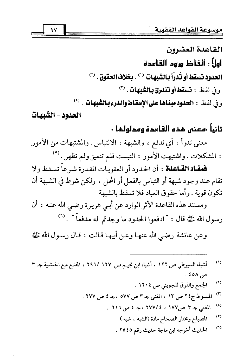 ومستند هذه القاعدة الأثر الوارد عن أبي هريرة رضي الله عنه: أن رسول الله - صلى الله عليه وسلم - قال: "ادفعوا الحدود ما وجدتم له مدفعاً". (¬6)