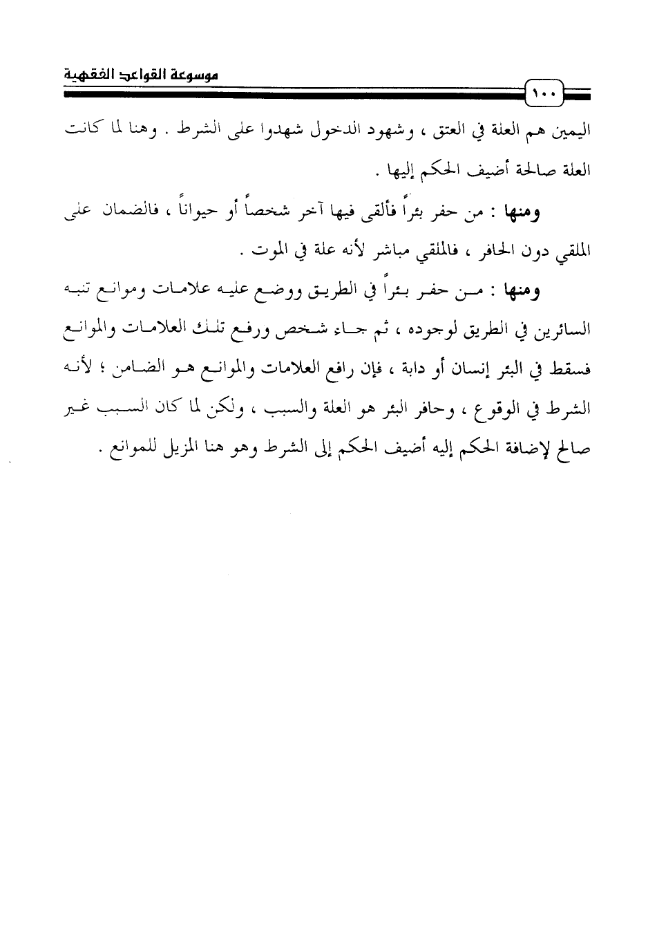 ومنها: من حفر بئراً في الطريق ووضع عليه علامات وموانع تنبه السائرين في الطريق لوجوده، ثم جاء شخص ورفع تلك العلامات والموانع فسقط في البئر إنسان أو دابة، فإن رافع العلامات والموانع هو الضامن؛ لأنه الشرط في الوقوع، وحافر البئر هو العلة والسبب، ولكن لما كان السبب غير صالح لإضافة الحكم إليه أضيف الحكم إلى الشرط وهو هنا المزيل للموانع.